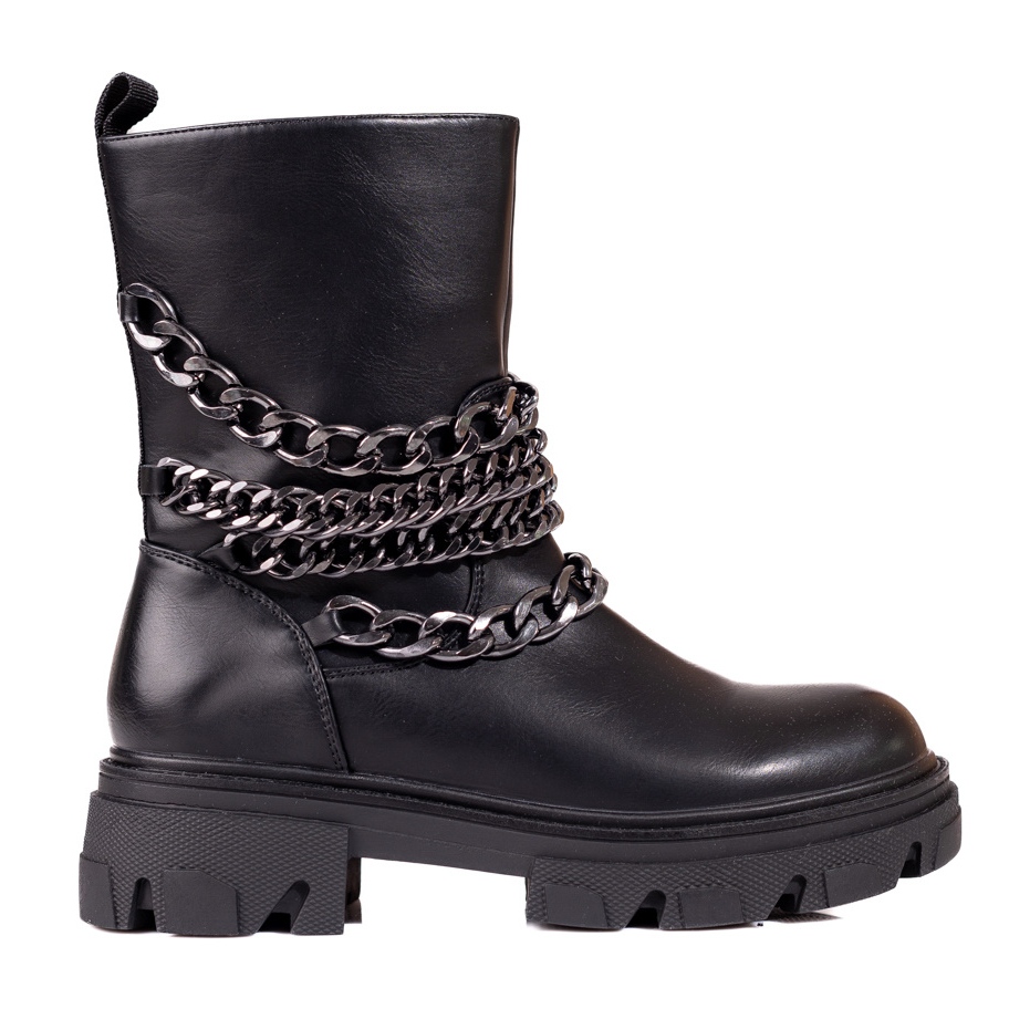 Stylische, schwarze Frauenarbeiter mit einer dekorativen Kette - perfekt für die Herbst/Winter -Saison. Aus ökologischem Leder, isoliert mit einer Schuhedecke, mit einem bequemen Reißverschluss und einer stabilen Sohle mit einem Profil. Die Kombination aus Rockcharakter mit täglicher Bequemlichkeit.