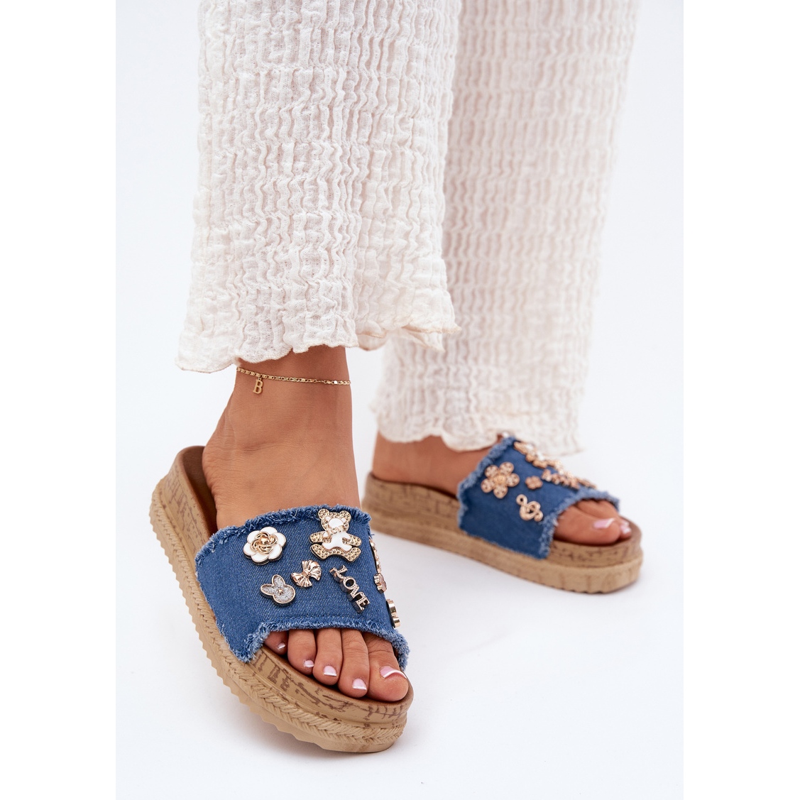 Damenzehenstegsandalen mit goldenen Stiften auf der Plattform Marineblau