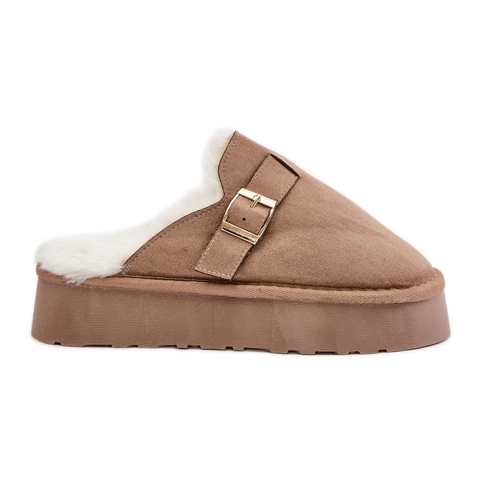 Inna marka Damenhausschuhe auf dicker Sohle mit Fell und Schnalle, dunkelbeige von Linneola