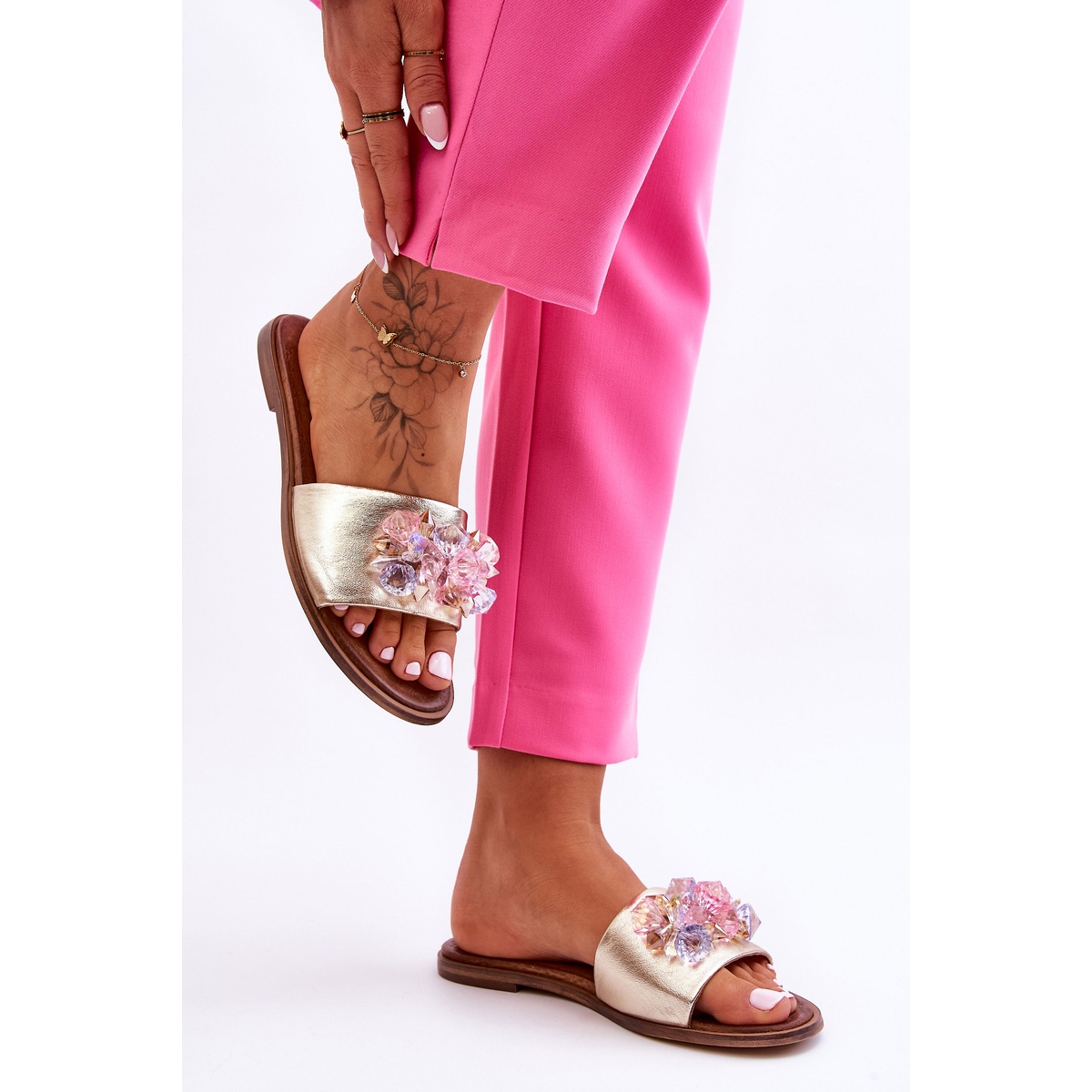 Wir präsentieren Damen-Leder-zehenstegsandalen mit Dekoration Nicole 2726/064 in einer wunderschönen Goldfarbe, die die perfekte Wahl für Frühlings- und Sommertage sind! Diese klassischen Slipper von Nicole sind vollständig aus hochwertigem Naturleder gefertigt, was nicht nur für Langlebigkeit, sondern auch für außergewöhnlichen Tragekomfort sorgt.