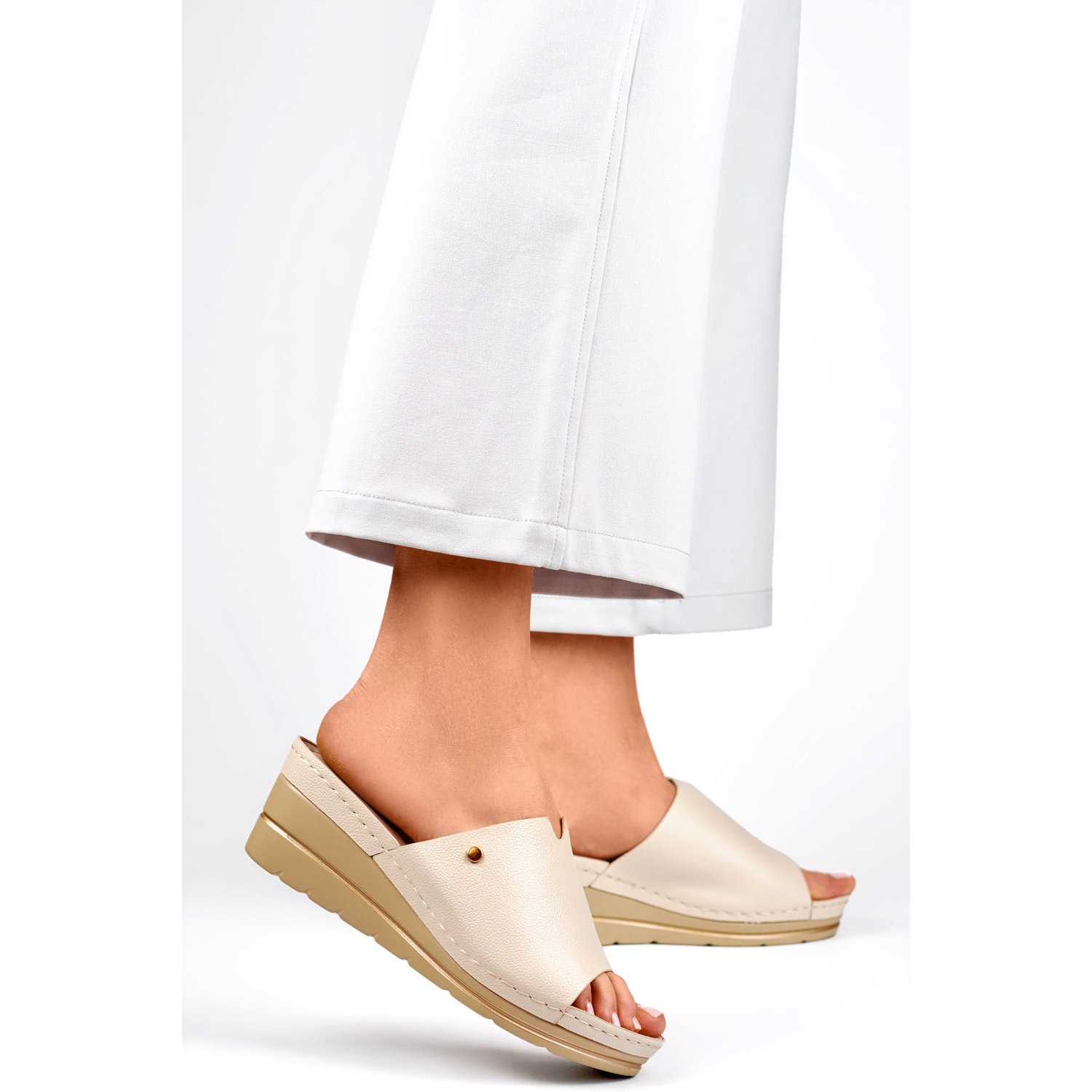 Das Innere der Klappen ist mit natürlichen Leder ausgekleidet, was eine hervorragende Belüftung und eine effektive Absorption von Feuchtigkeit gewährleistet. Dank dessen bleiben die Füße auch während langer Zeit frisch und trocken. Die Ferse in Form eines 5 -cm -Hochkeils verleiht ihnen ein elegantes Aussehen und garantiert gleichzeitig Stabilität und Komfort bei jedem Schritt.