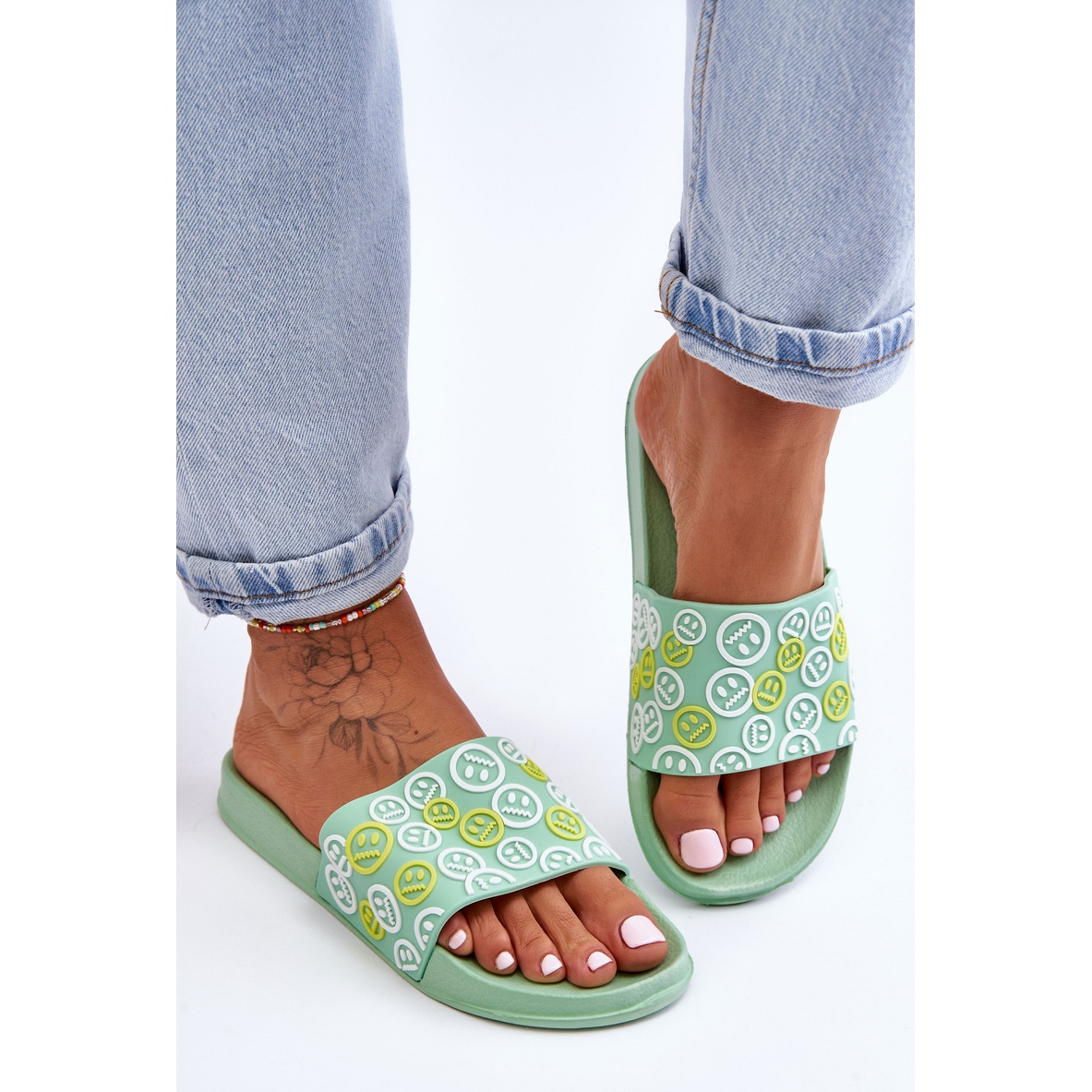 Frauen -Cosette -Hausschuhe mit Emoticons - grün, leicht und komfortabel. Perfekt für den Sommer, für den Strand, den Schwimmbad und für den täglichen Gebrauch.