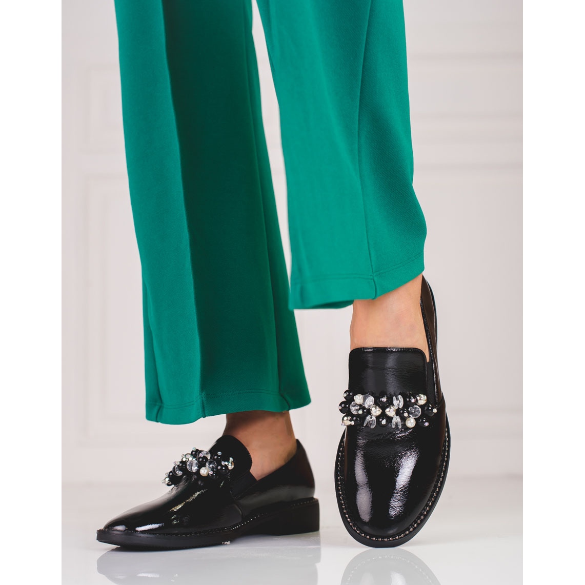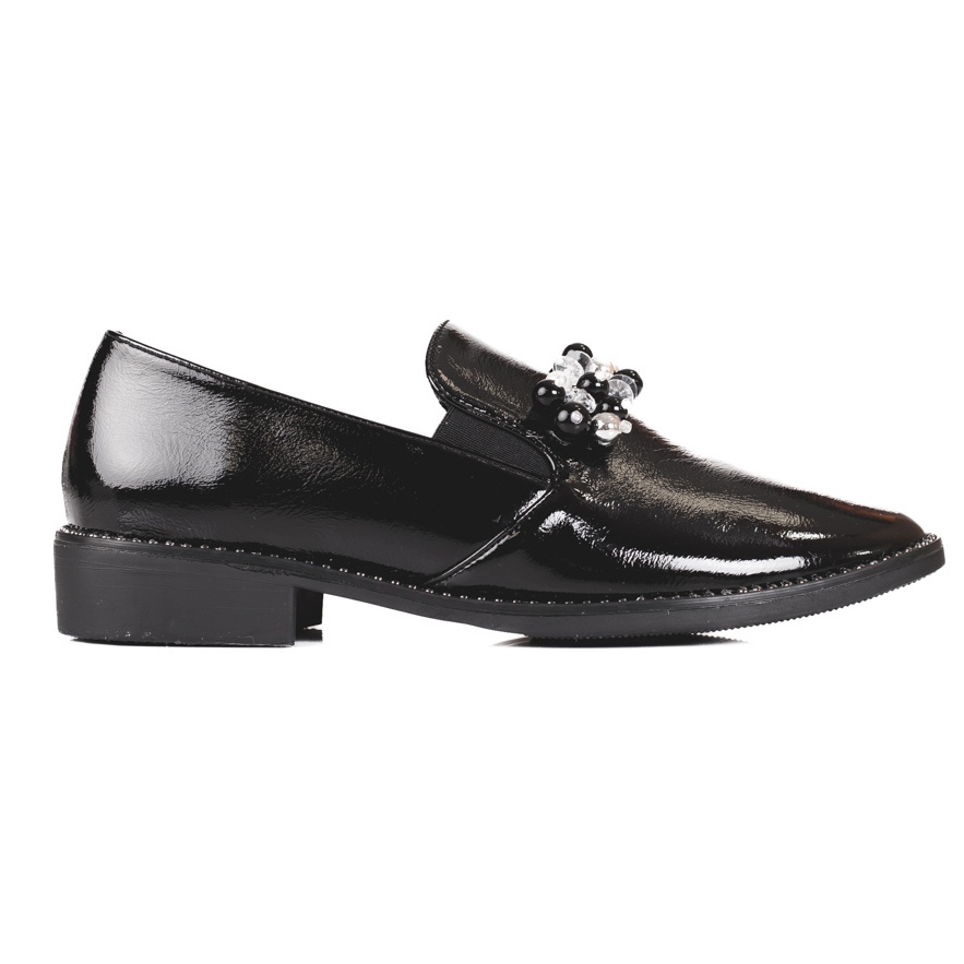 Elegante, schwarze Lords in einem lackierten Finish ist die perfekte Kombination von Klassikern und modernem Stil. Das Modell des Herstellers, der eine andere Marke hat, wird durch eine subtile Dekoration von Strasssteinen unterschieden, die Charakter ohne übertriebene Ostzeption verleiht. Dies sind eingeführte Schuhe mit geschlossener, runder Nase und einer sanft gebauten Absatz - Tragenkomfort, die von einem natürlichen Ledereinsatz bereitgestellt werden.