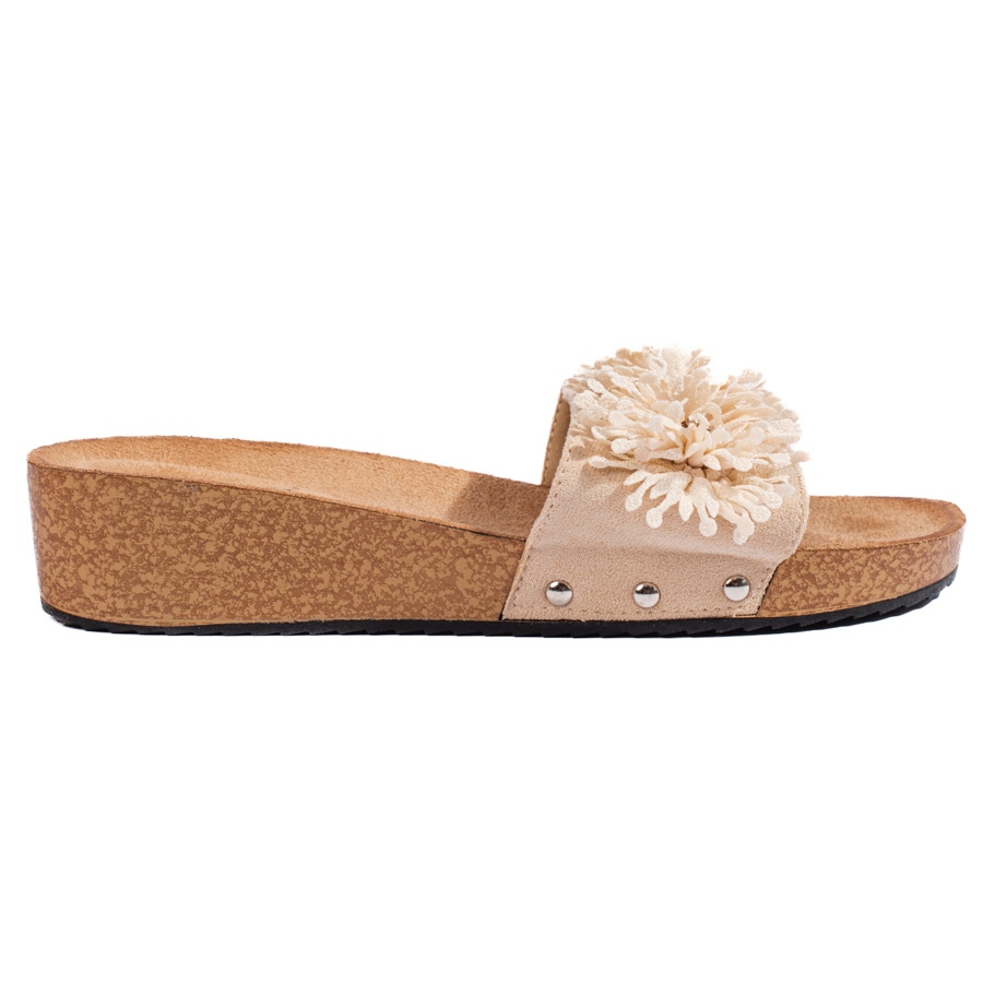 Details: Damenpantoffeln aus beigem Wildleder mit Blumen
