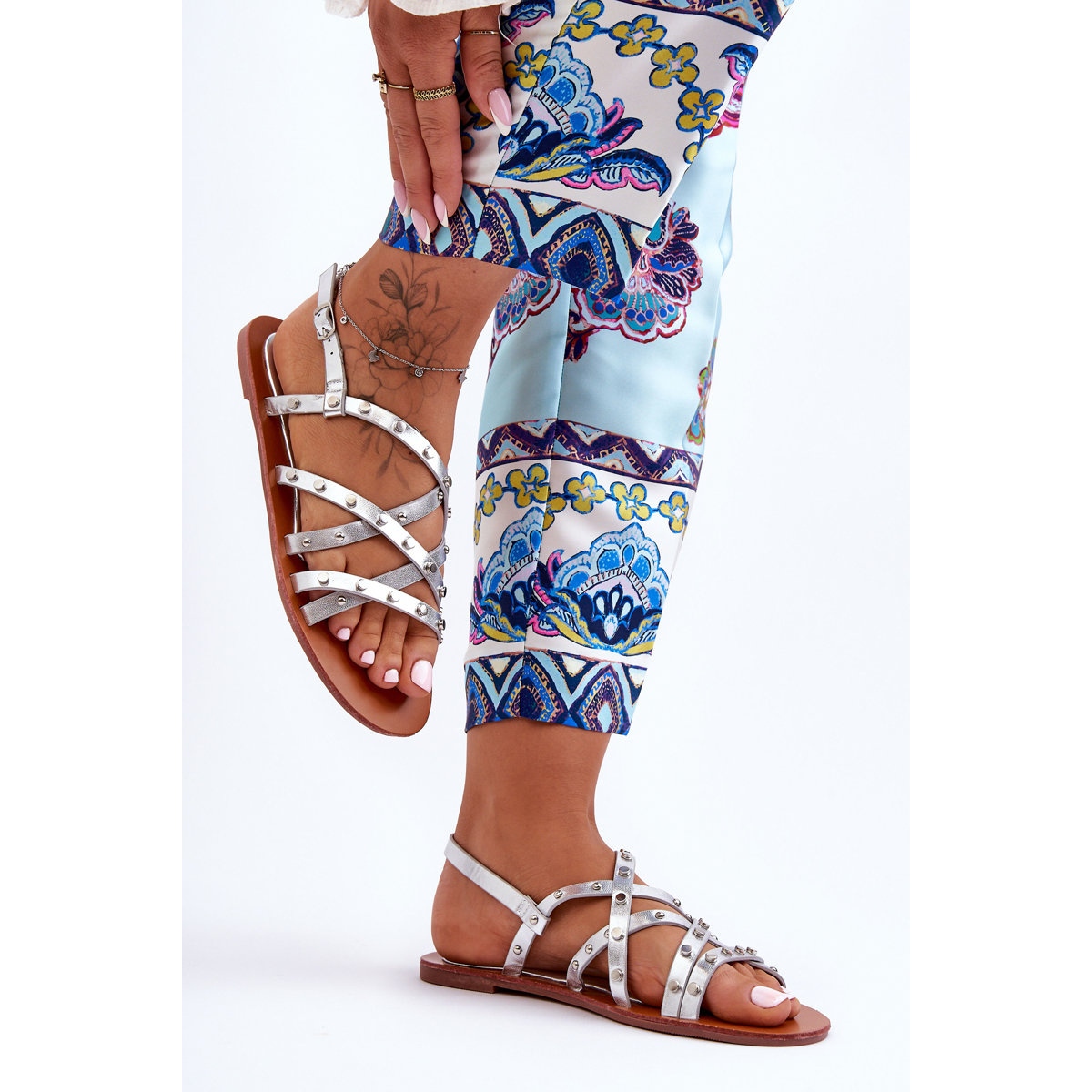 - Modell: Damensandalen mit silbernen Verzierungen