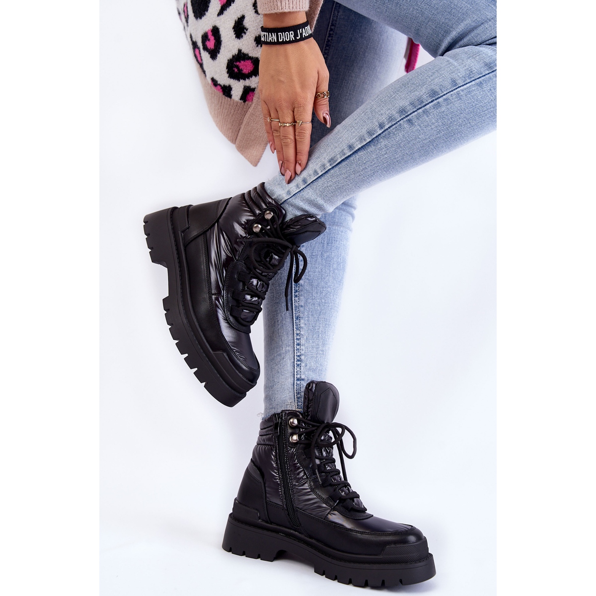 Stilvolle und praktische Stiefel für kältere Tage. Der äußere Teil besteht aus hochwertigem Stoff und ökologischem Leder. Das mit weiche Fell isolierte Innenraum bietet Komfort und Wärme. Die feste Schnürung wurde mit einer Seitenschloss ergänzt, um sich anzuziehen. In einer flachen Ferse mit einer klaren Profilplattform - ideal für städtische Stile für Herbst und Winter.