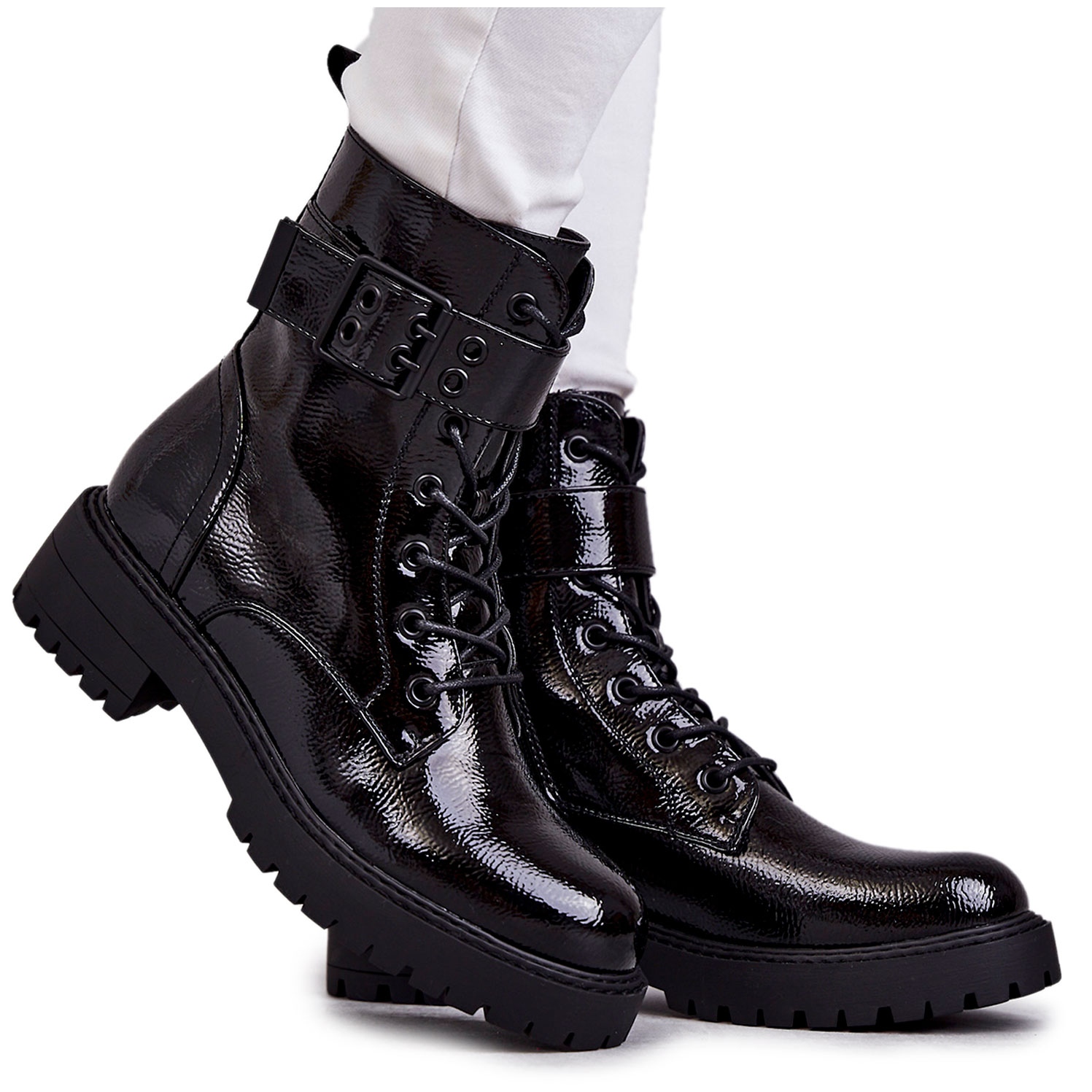 Details: PJ1 Damenstiefel lackiert geschnürt auf einem flachen Absatz schwarz Firmina