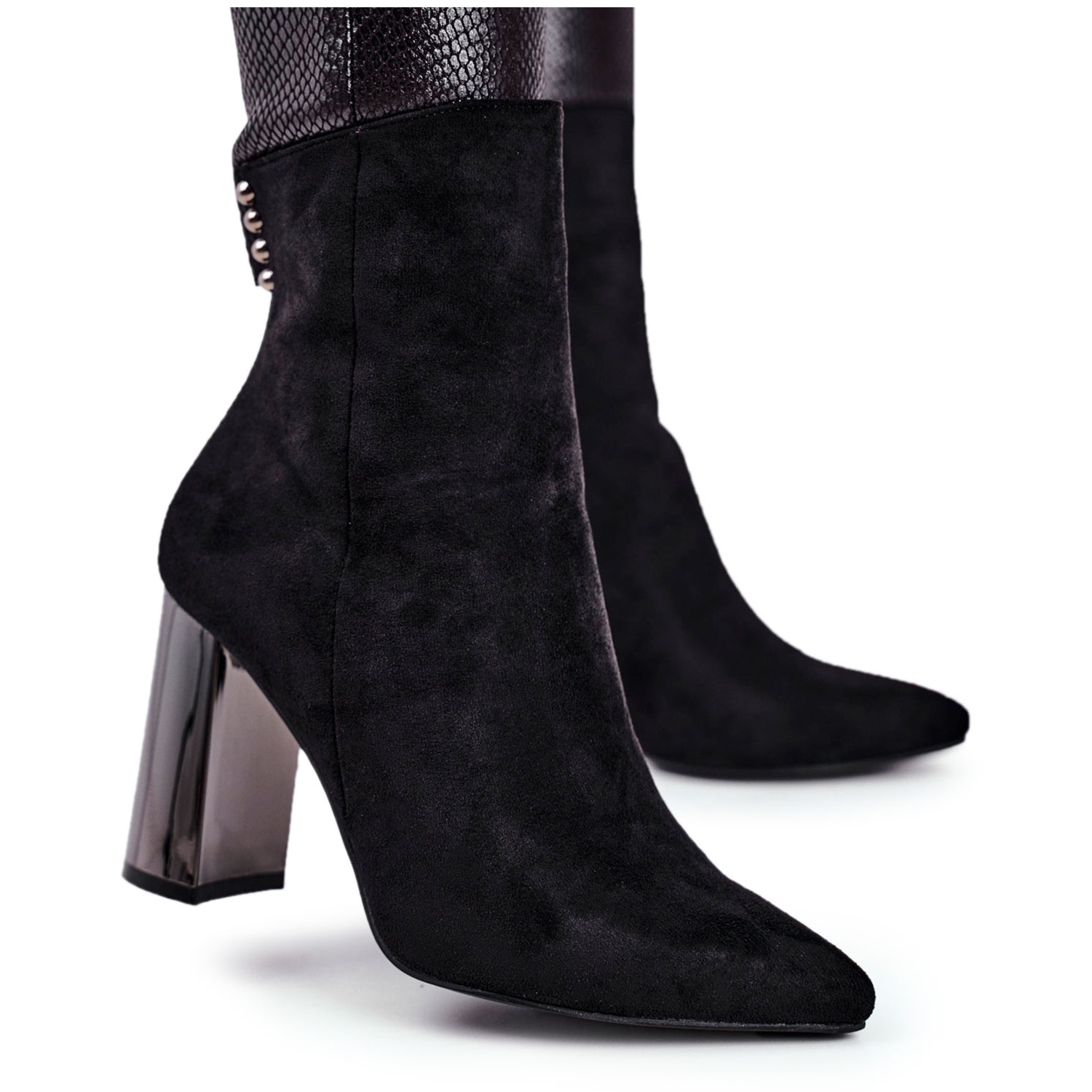 Entdecken Sie einzigartige Damen-Stiefeletten mit hohen Absätzen in der stilvollen schwarzen Farbe, die neu in der KeeShoes-Kollektion sind. Aus hochwertigem Öko-Wildleder gefertigt, sehen diese Stiefel nicht nur elegant aus, sondern sorgen auch für Tragekomfort. Der 9,5 cm hohe Spiegelabsatz verleiht ihnen einen modernen Charakter und der stabile Pfosten garantiert Sicherheit beim Gehen.