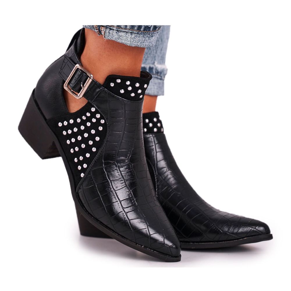Das 9 cm hohe Obermaterial besteht aus hochwertigem ökologischem Leder, was nicht nur für ein ästhetisches Erscheinungsbild, sondern auch für Tragekomfort sorgt. Seitliche Einkerbungen am Obermaterial und eine modische Schnalle erleichtern das An- und Ausziehen der Schuhe, zusätzliche Strasssteine verleihen ihnen Charakter. Ein niedriger, flacher Absatz (5 cm) garantiert Komfort und betont gleichzeitig die Eleganz der Figur.