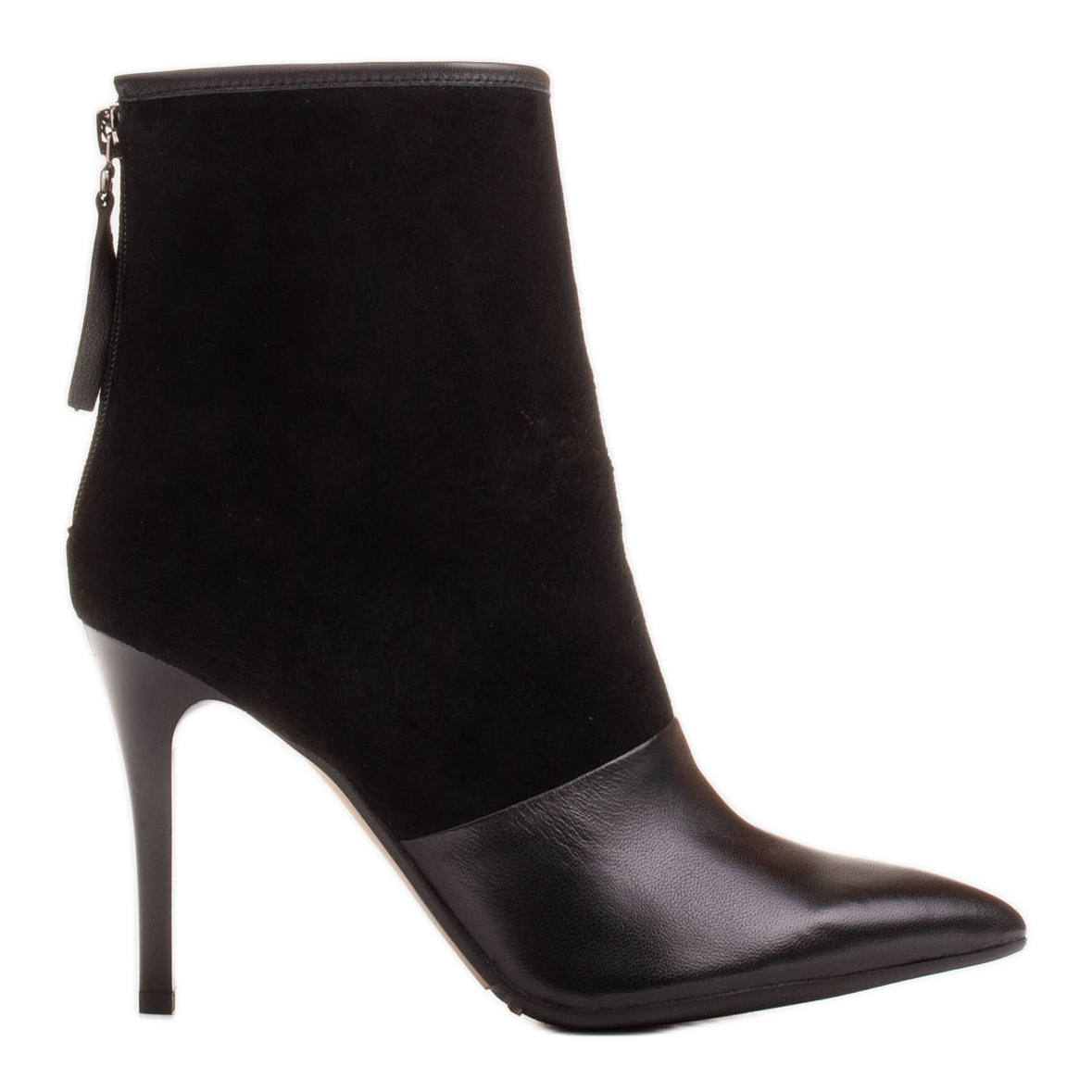 Wir präsentieren ein Modell aus den besten Materialien: Eine Kombination aus natürlich genarbtem Leder und zartem Wildleder ist ein Garant für Qualität und ein einzigartiges Erscheinungsbild. Schwarz – ein unbestrittener Klassiker der Weltmode – wird hier in der universellsten und elegantesten Variante verwendet, wodurch diese Stiefel perfekt zu vielen Garderobenelementen passen – vom Business-Anzug über Abendkleider bis hin zu lässigeren Sets.
