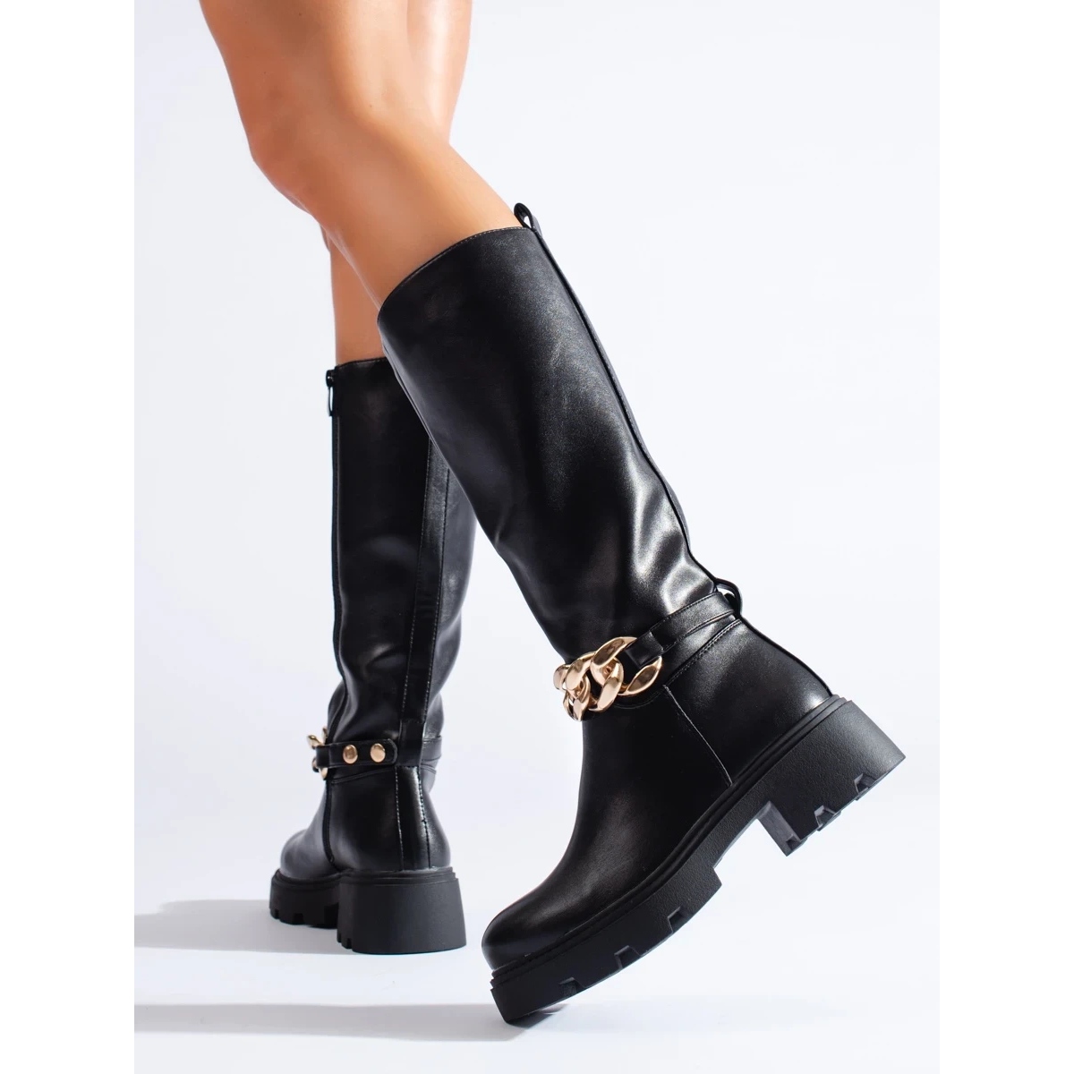Elegante und praktische Stiefel, die eine klassische Form mit einem modischen Akzent in Form einer dekorativen Kette kombinieren. Hergestellt aus ökologischem Leder, isoliert, mit einem komfortablen Reißverschluss - perfekt für die Herbst/Winter -Saison, sowohl jeden Tag als auch für Abendausflüge.