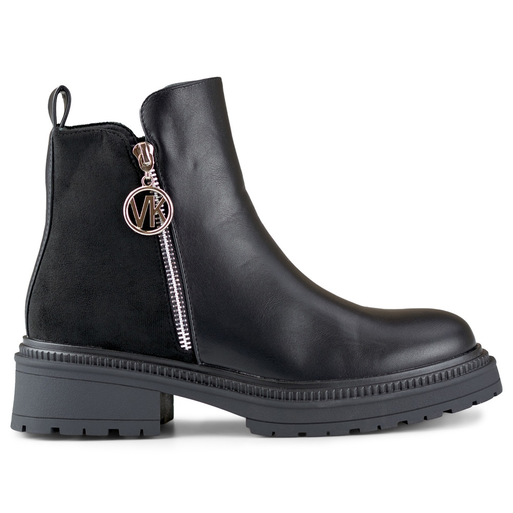 Elegante, schwarze Knöchelstiefel mit einem dekorativen Schloss, das einen modischen Look mit Funktionalität kombiniert. Hergestellt aus ökologischem Leder mit ökologischen Wildleder, isoliert mit einem Pelzeinsatz - perfekt für kühlere Tage. Die 2,5 cm stabile Plattform bietet eine bequeme Unterstützung bei der Aufrechterhaltung eines weiblichen Profils.