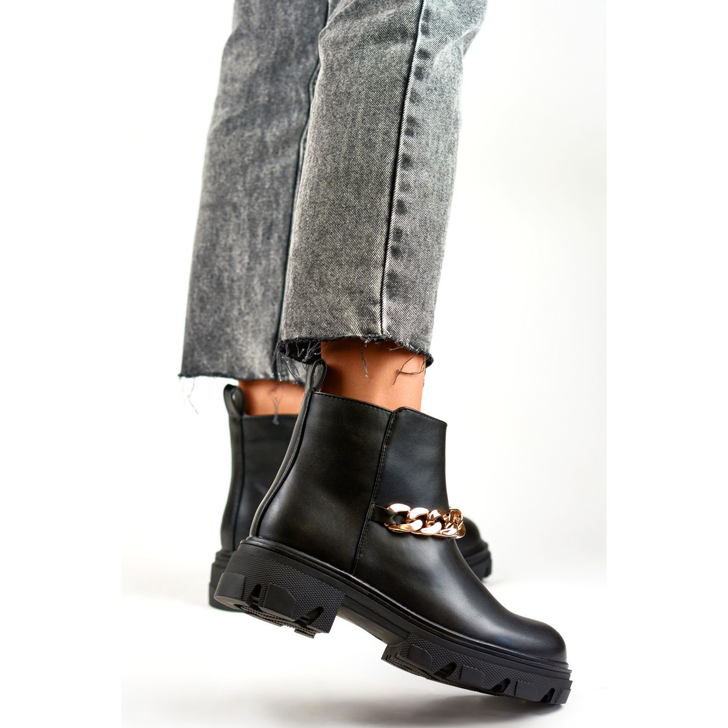 Frauenstiefel mit einer Kette - schwarz, Öko -Leather