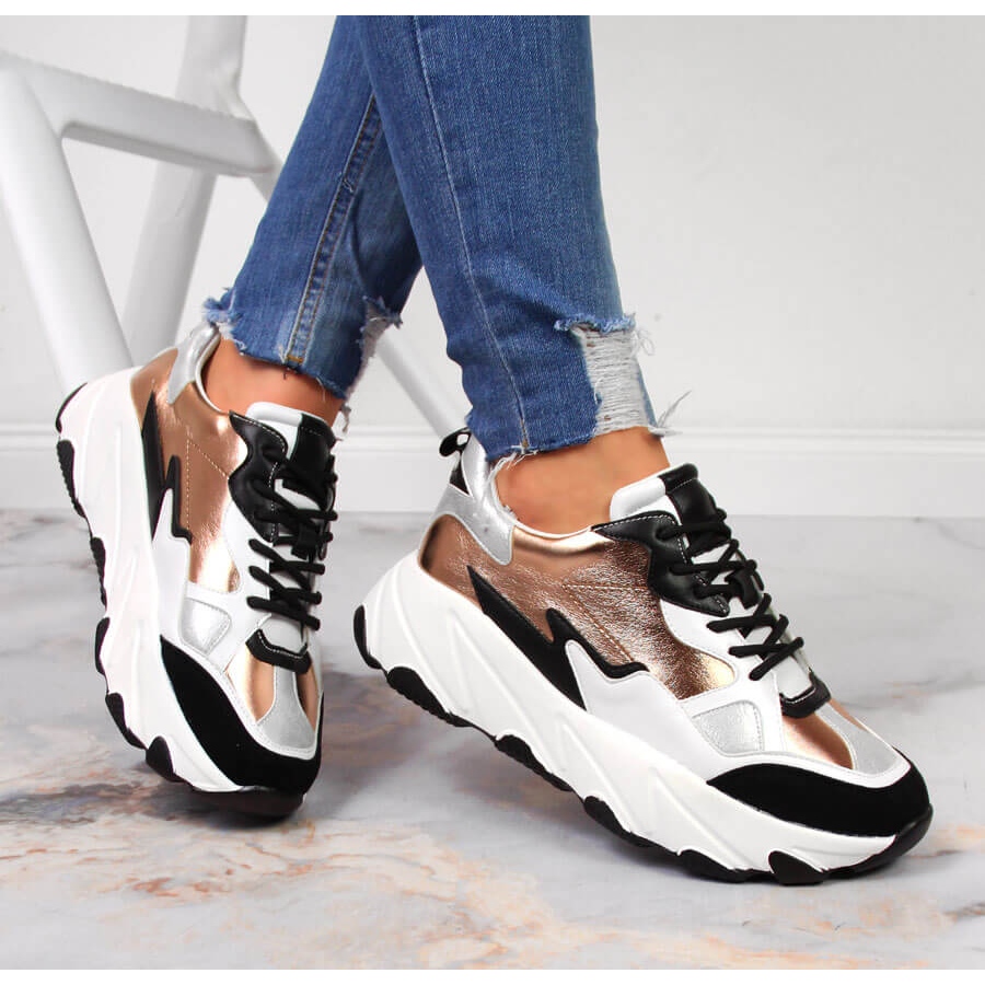 Damen-Turnschuhe Potocki-White- und Gold-Plattformen, die jede Stylisierung verändern. Der elegante und gleichzeitig sportliche Schnitt kombiniert Komfort mit einem modischen Look: Eine weiche, textile Futter und ökologische Ledereinsatz sorgt für Komfort aus der ersten Annahme, und die dekorative Plattform betont die Figur und fügt ein paar Zentimeter hinzu, ohne die Bequemlichkeit zu verbringen.
