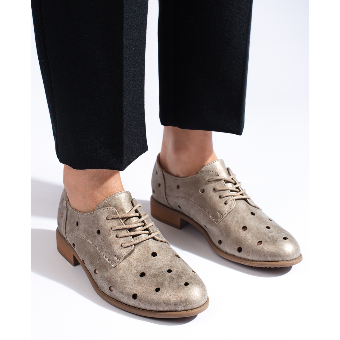 Wir präsentieren durchbrochene Daszyński-Damenschuhe in einem eleganten Goldton, die jedem alltäglichen oder einzigartigen Styling Stil verleihen. Diese einzigartigen Schuhe des renommierten Herstellers DASZYŃSKI vereinen Modernität und klassischen Stil, was sie zu einer idealen Wahl für Frauen macht, die Wert auf Komfort und Ästhetik legen.