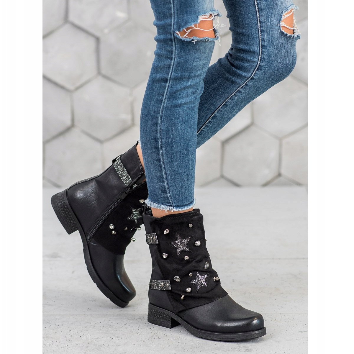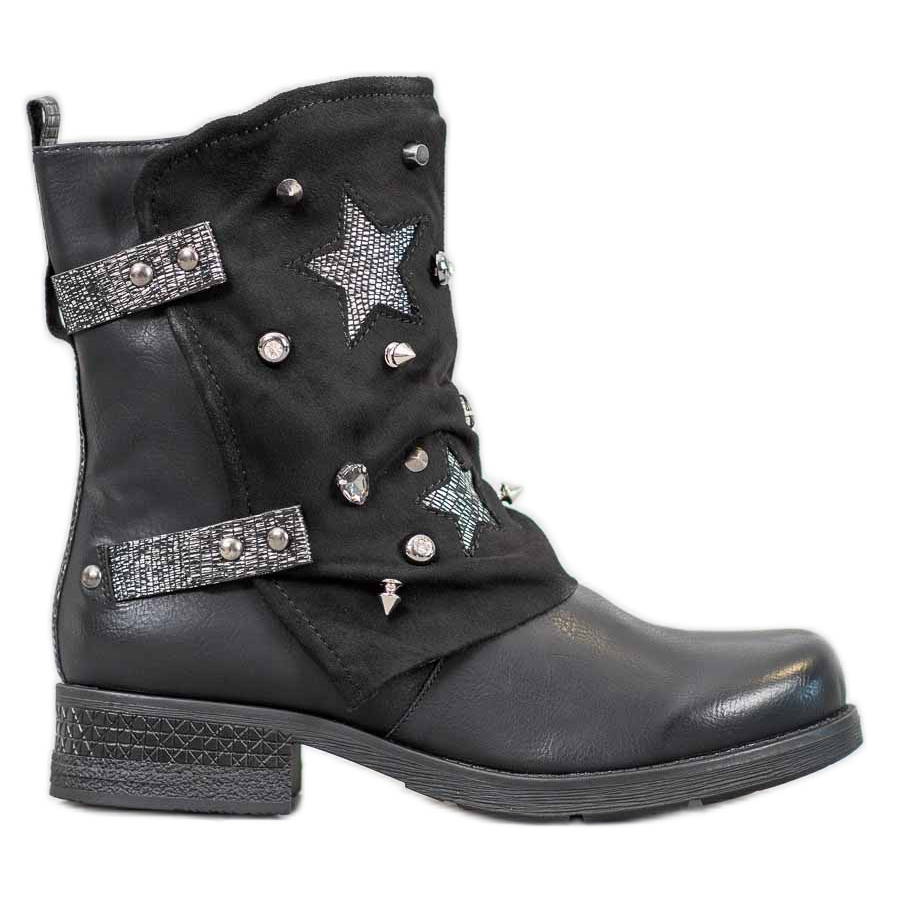 Die vorgestellten Schuhe gehören eindeutig zur Casual-Kategorie – perfekt für alltägliche Ausflüge, aber dank ihrer Originalität passen sie auch perfekt zu formelleren oder abendlichen Stylings. Dies ist ein Beweis dafür, dass Super Mode Decorated Workers Schwarz Stiefel sind, die zu vielen Anlässen passen.