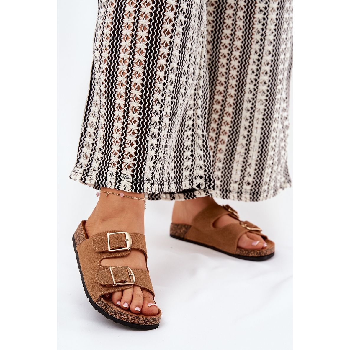 Entdecken Sie stilvolle Pantoffeln für Frauen auf einer Korkplattform, die Komfort perfekt mit modischem Design verbindet. In einem wunderschönen braunen Farbton sind diese Flip -Flops mit zwei Streifen mit eleganten goldenen Schnallen ausgestattet, die nicht nur das Auge fangen, sondern auch eine perfekte Passform zum Fuß sorgen.