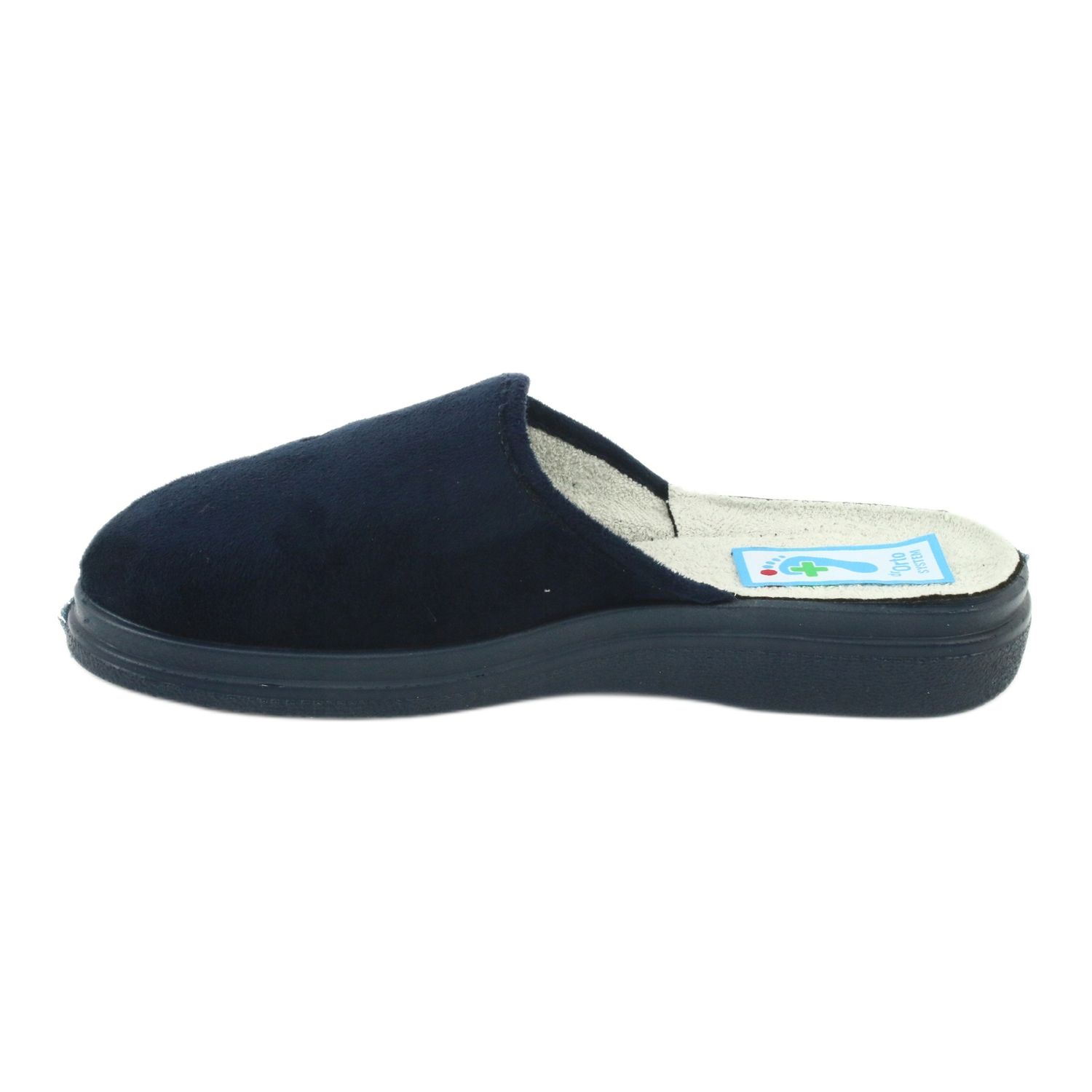 Bequeme und sichere Hausschuhe der polnischen Marke Befado aus der Dr.-Linie. Orto, Modell 132D012 in einem eleganten Marineblauton. Entwickelt für Menschen, die eine besondere Pflege ihrer Füße benötigen, einschließlich Menschen mit diabetischen Füßen. Sie verfügen über das Zertifikat „GESUNDER FUSS“.