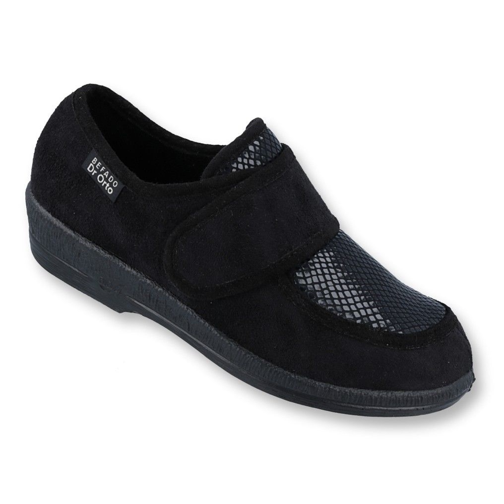 DR.ORTO Befado PU 984D012 – bequeme, praktische Damenschuhe in Schwarz, konzipiert für alltäglichen Komfort – zu Hause und draußen. Das flexible Obermaterial aus dehnbarem Stoff passt sich dem deformierten Fuß an und der Klettverschluss ermöglicht ein schnelles und bequemes Anziehen und eine präzise Anpassung. Die Sohle aus elastischem PU absorbiert Mikroverletzungen und verbessert die Dämpfung beim Gehen.