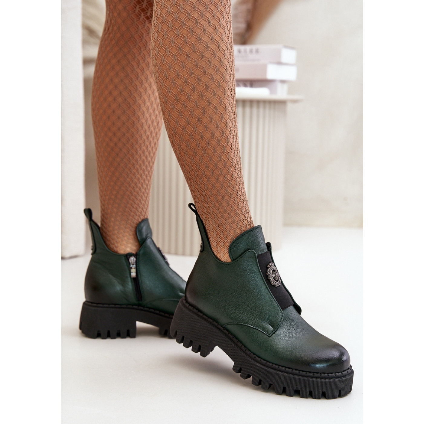 Wir präsentieren Frauen -Zazoo -Stiefel in einem schönen, dunkelgrünen Farbton, der Ihre Garderobe perfekt ergänzt. Sie bestehen aus hochwertigem natürlichen Leder und kombinieren Komfort und Eleganz. Ihr einzigartiges Design basiert auf einer massiven Ferse mit einer Höhe von 6 cm und einer Plattform mit Rillen (3,5 cm) sorgt für Stabilität und Komfort beim Tragen.