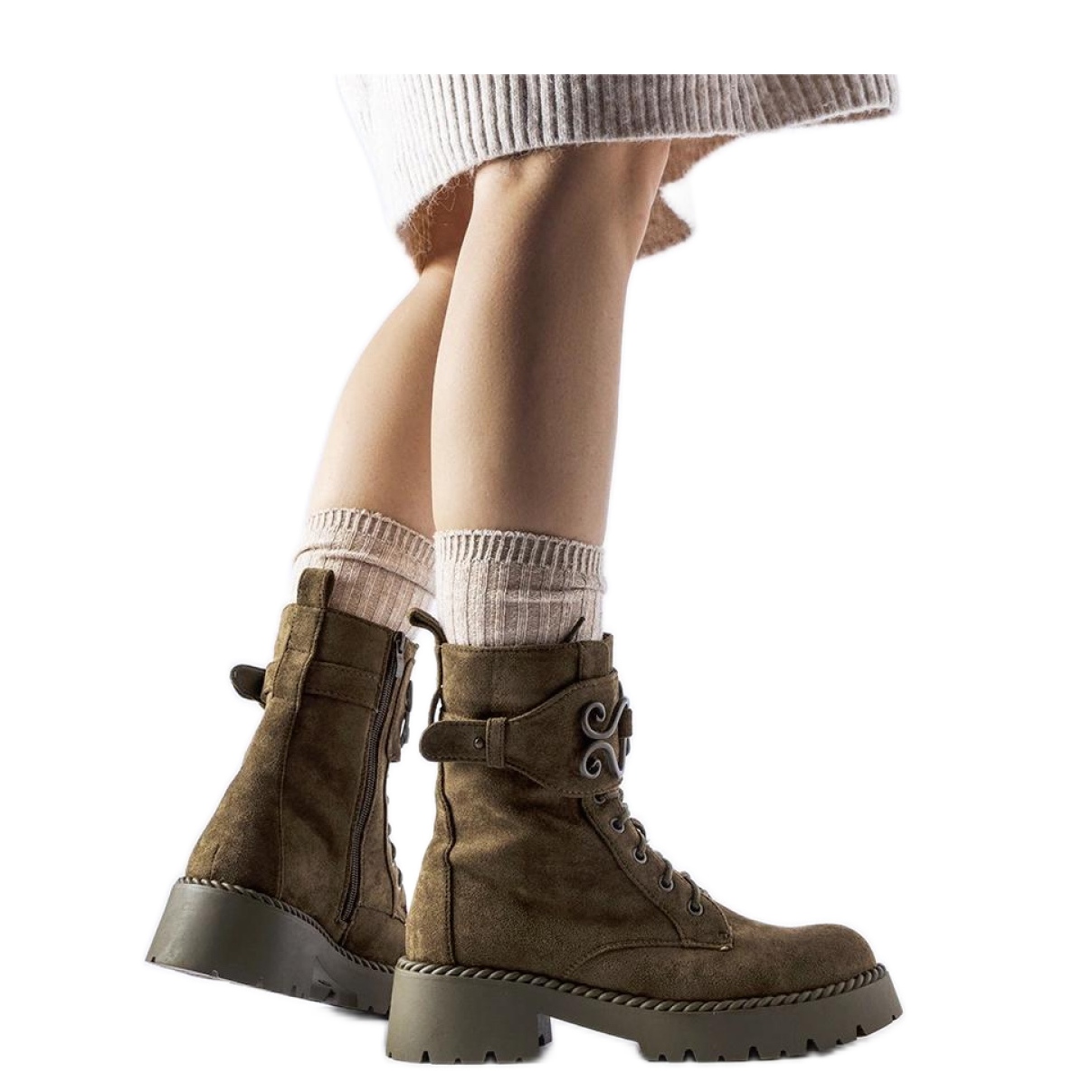 Dunkelgrüne dekorative Öko-Zamsz-Arbeiter sind die perfekte Wahl für Frauen, die Mode mit Komfort kombinieren möchten. Diese stilvollen Schuhe, die in der Herbst-/Winterkollektion erhältlich sind, zeichnen sich nicht nur durch Farben, sondern auch sorgfältige Verarbeitung von ökologischem Leder mit hoher Qualität im Wildlederstil aus. Ihr ursprüngliches Erscheinungsbild wird sicherlich Aufmerksamkeit erregen und den Charakter jeder Winterstilisierung hinzufügen.