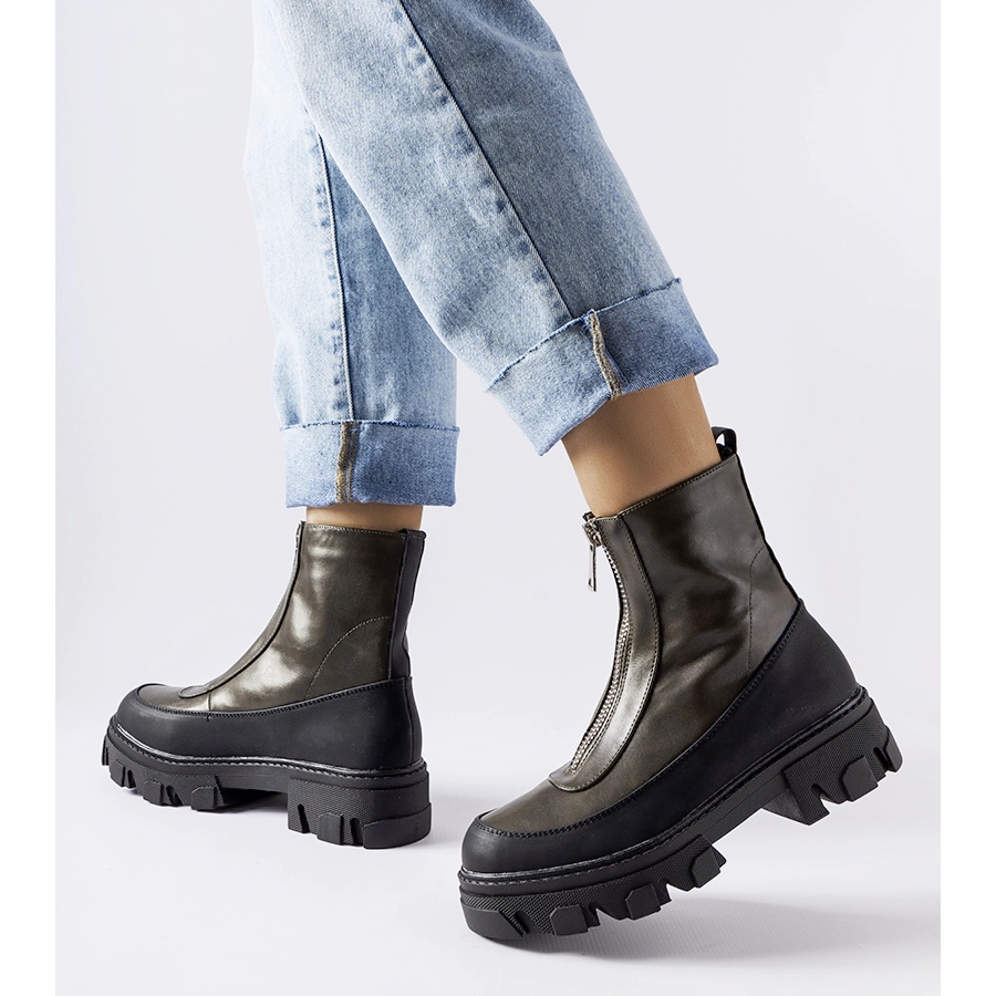 Moderne Stiefel für aktive und modische Frauen. Die massive Silhouette und der zeitlose, dunkelgrüne Farbton (DK.Grreen / Khaki) verbinden sich hier mit praktischen Lösungen: ein bequemes Schloss, das das Anziehen, eine stabile Gummisohle und ein höheres Obermaterial erleichtert, das den Fuß gut hält und vor Kälte und Wind schützt. Das minimalistische Design ohne Muster und schwarze Akzente auf der Sohle verleihen den Schuhen einen universellen Charakter - sie passen jeden Tag und stilisiertere Outfits.