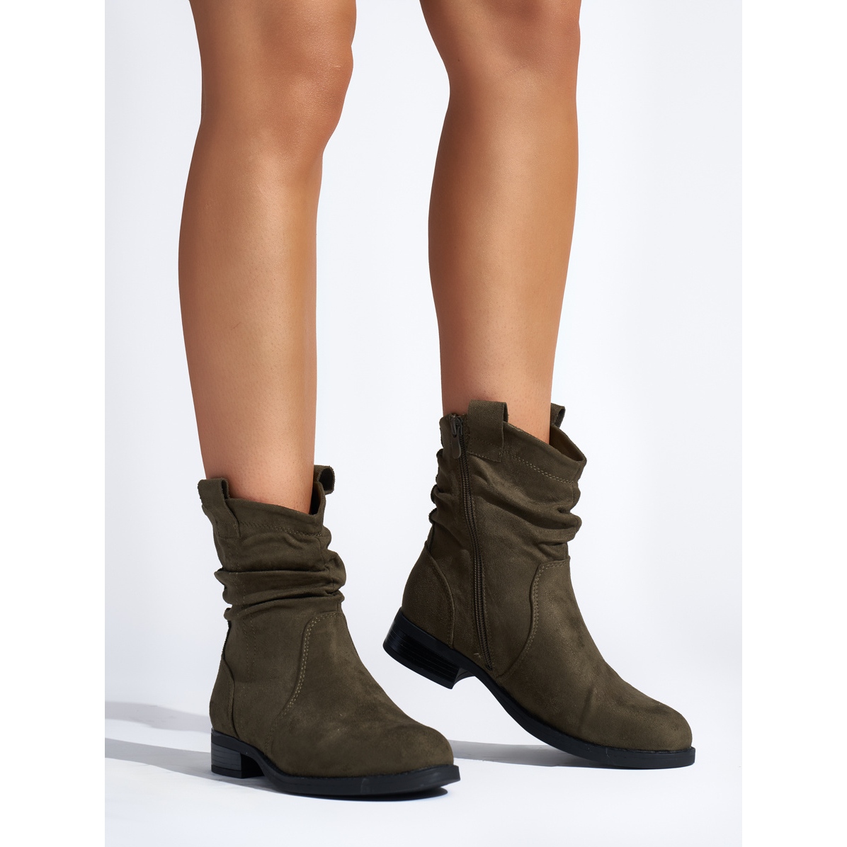 Inna marka Dunkelgrüne Wildlederstiefeletten mit Rüschen