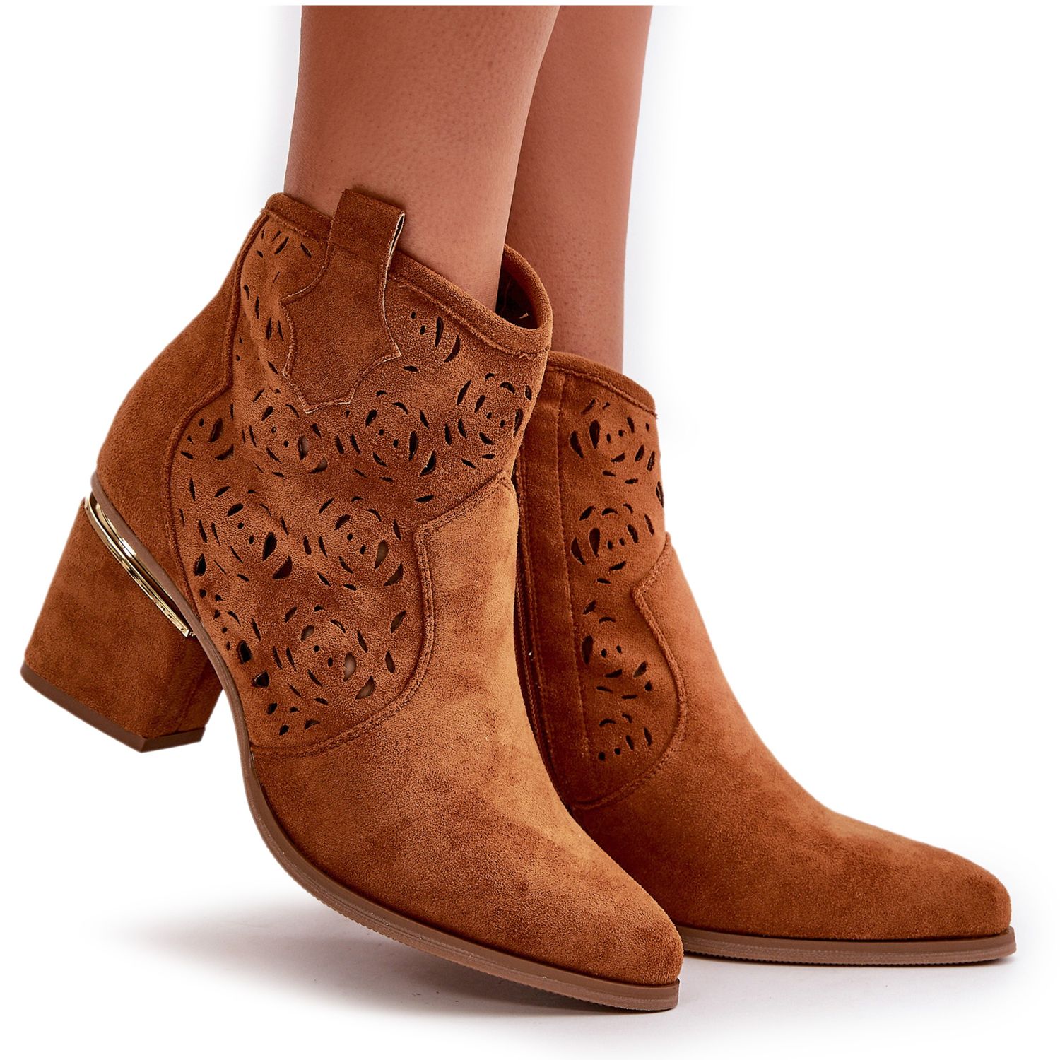 Das charakteristische Openwork -Obermaterial verleiht Leichtigkeit und subtiler Charme, wobei er Looks anzieht und sich von anderen Modellen abhebt. Die Ferse in Form eines Pfostens, das mit einem Spiegeldetail dekoriert ist, erhebt nicht nur den ganzen Look, sondern sorgt auch für Stabilität beim Tragen. Dank der Mandelzehen strahlen Stiefel Eleganz aus, was sie sowohl für alltägliche Stylierungen als auch für anspruchsvollere Outfits perfekt macht.