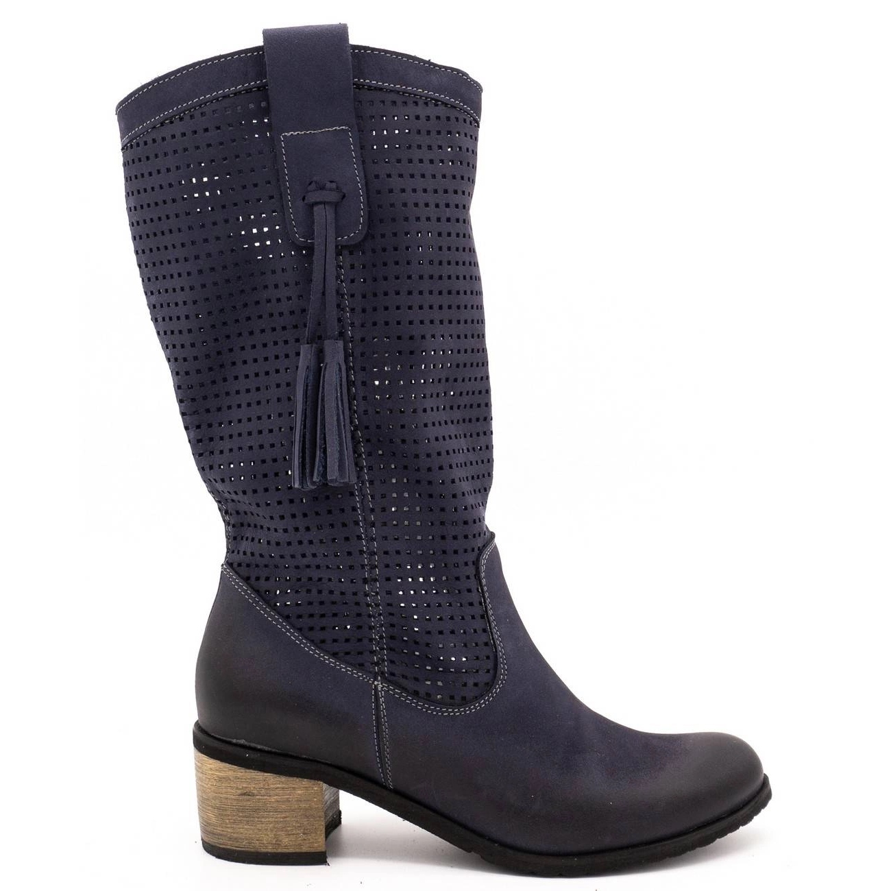 Elegante, offene Frauenstiefel Olivier D44 in einem tiefen dunkelblauen Schatten. Ein klassisches Knie mit zarten Ausschnitten und dekorativen Rändern, die Charakter hinzufügen. Perfekt für Frauen, die jeden Tag ein stilvolles und gleichzeitig bequemes Aussehen schätzen.