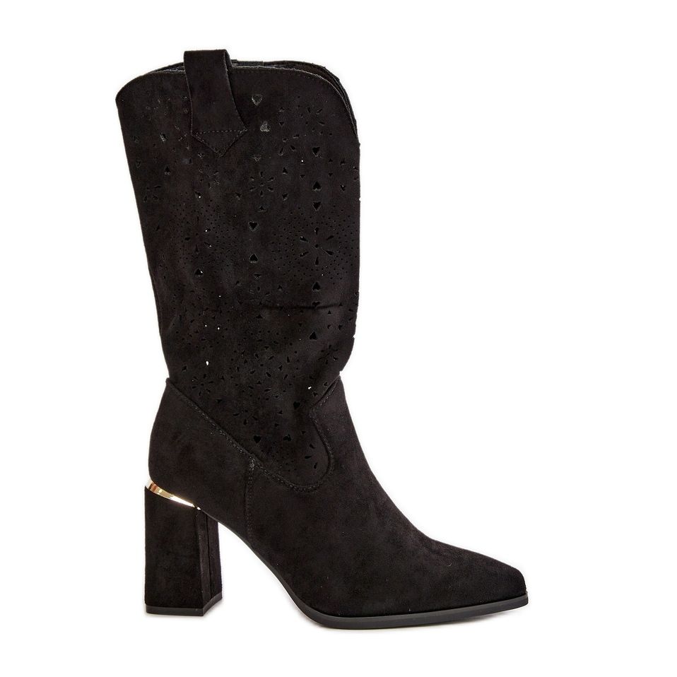 Details: Durchbrochene Damenstiefel mit hohem Absatz und spitzen Zehen, Öko-Wildleder in Schwarz von Nevithra
