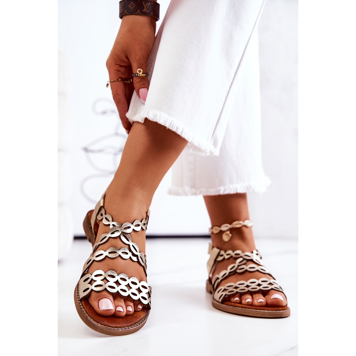 Die Sandalen sind in einer modischen Goldfarbe erhältlich, die perfekt zu verschiedenen Stilen passt – sowohl lässig als auch eleganter. Dank eines flachen 1 cm hohen Absatzes eignen sie sich perfekt für lange Spaziergänge und Alltagsausflüge.
