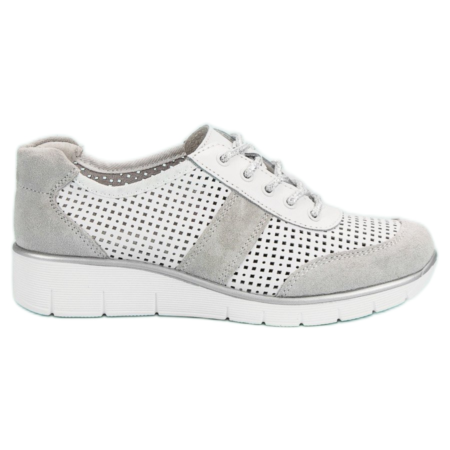 Dies sind die durchbrochenen Lederschuhe von Filippo in Weiß, die eine perfekte Wahl für jede Frau sind, die Komfort mit Eleganz verbinden möchte. Diese einzigartigen Schuhe zeichnen sich durch durchbrochene Einsätze aus, die ihnen Feinheit verleihen, aber gleichzeitig durch ihre Ausdruckskraft auffallen. Klassisches Weiß kombiniert mit Grau ist eine Kombination, die perfekt zu jedem Styling passt.