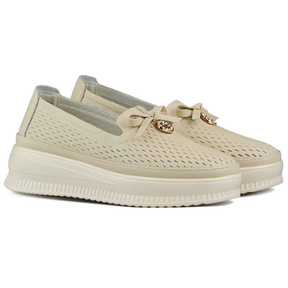 Details: Durchbrochene Lederschuhe für Damen, bequeme Mokassins aus Naturleder beige