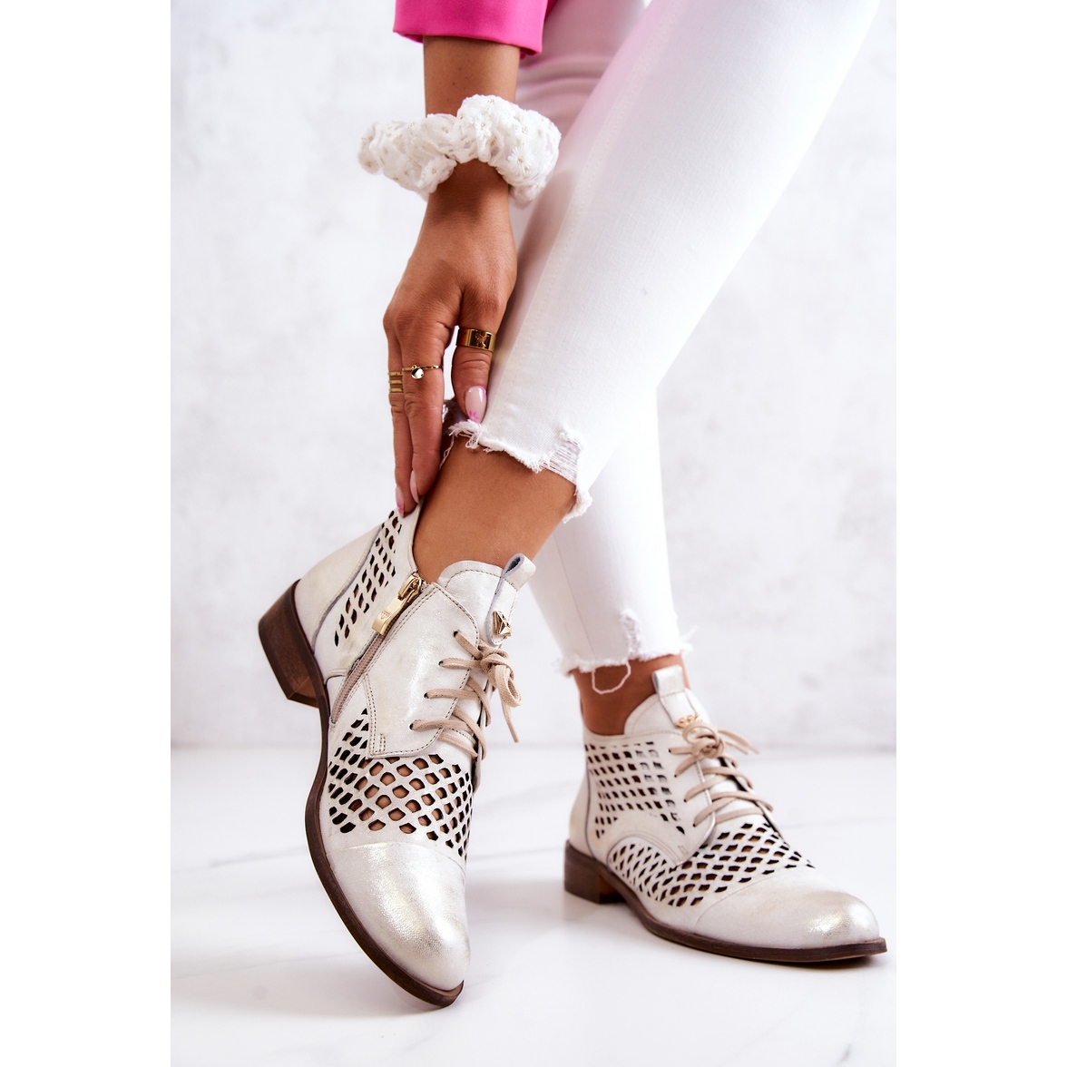 Entdecken Sie den Charme der durchbrochenen Stiefeletten Nicole 2704/004 in dezentem Weiß mit eleganten Goldakzenten. Diese einzigartigen Schuhe aus hochwertigem Naturleder vereinen Stil und Komfort und werden daher mit Sicherheit zu einem Schlüsselelement Ihrer Garderobe.
