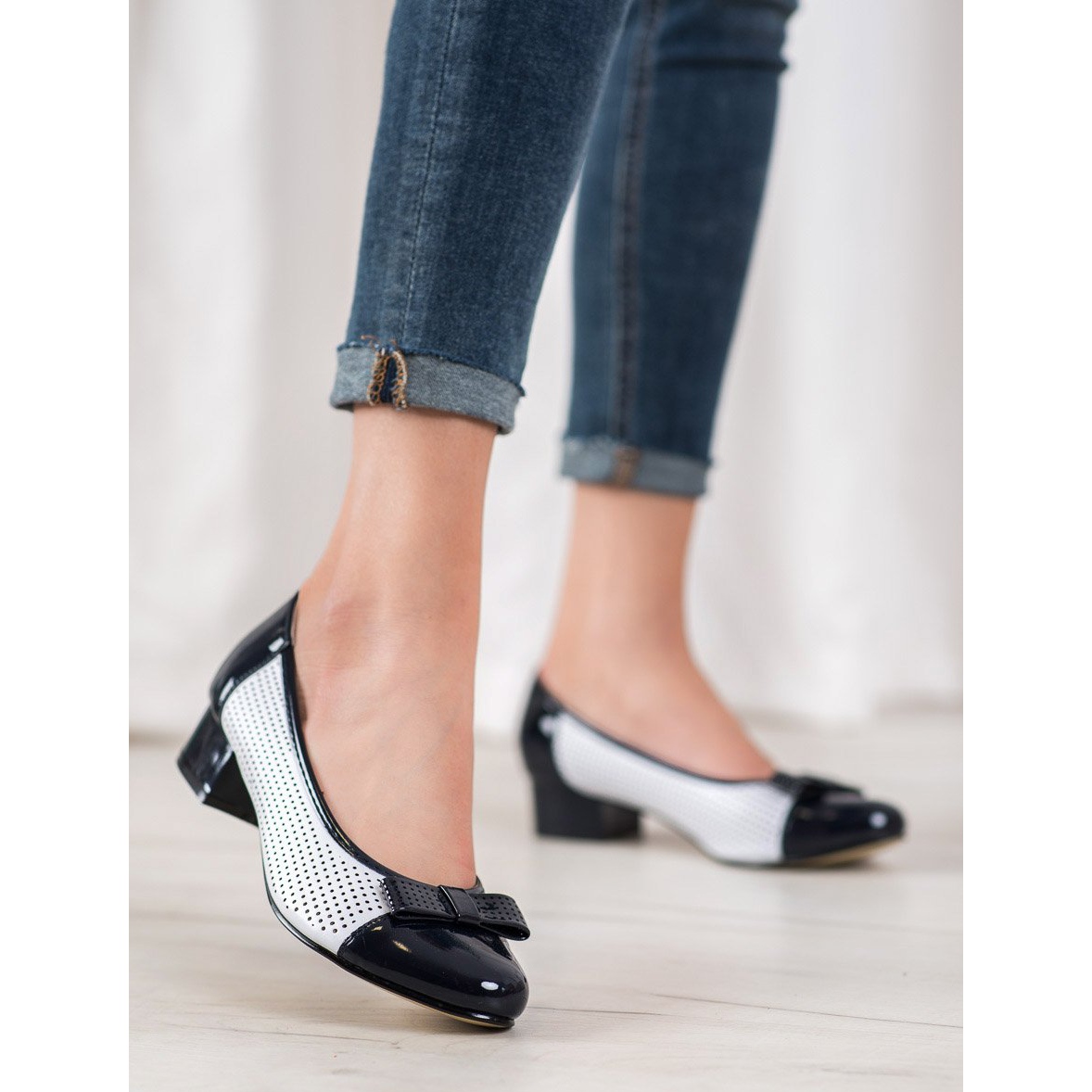 Die aus hochwertigem ökologischem Leder gefertigten Pumps sind leicht und sorgen so für Tragekomfort. Das durchbrochene Obermaterial leitet überschüssigen Schweiß effektiv ab, was sie zur perfekten Wahl für wärmere Tage macht. Eine dezente Schleife verleiht ihnen Charme und verleiht dem Schuhwerk einen originellen Stil und ein schickes Aussehen.