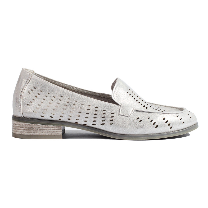 Das silberne Openwork-Modell von Potocki ist ein einzigartiges Schuhwerk, das durch seinen metallischen Glanz und das dezente, aber wirkungsvolle Openwork-Muster die Blicke auf sich zieht. Diese Damenmokassins sind die perfekte Wahl für Frauen, die Schuhe für den Alltag, aber auch für besondere Anlässe suchen.