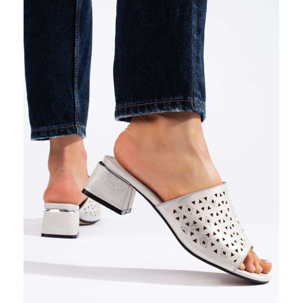 Wir präsentieren durchbrochene silberne zehenstegsandalen mit niedrigem Absatz, die die perfekte Wahl für den täglichen Gebrauch sind. Das Produkt einer renommierten Marke zeichnet sich durch einen klassischen, lässigen Stil aus, der perfekt zu vielen Sommer-Styles passt.