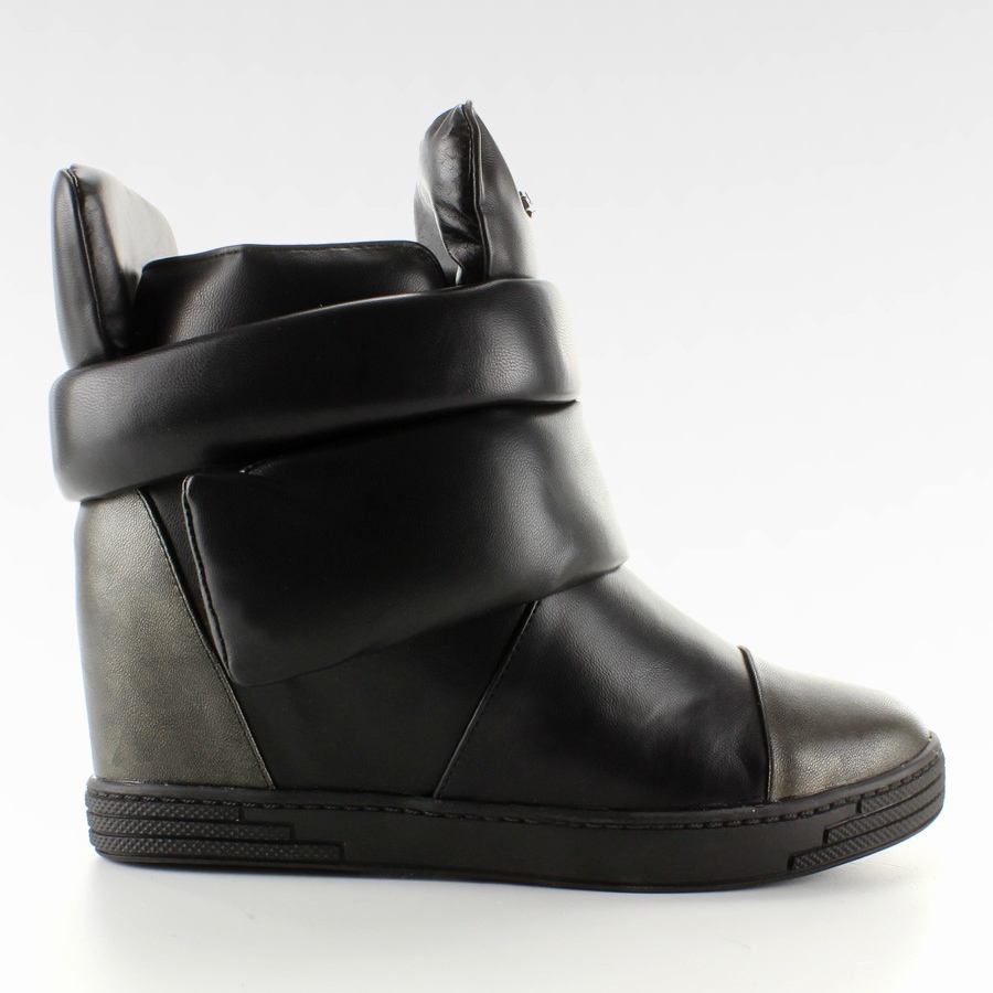 Diese schwarzen Sneaker kombinieren eine sportliche Silhouette mit urbanem Chic. Das Obermaterial mit originellem Schnitt besteht aus ökologischem Leder, das Ganze ist mit weichem Fell gefüttert, wodurch die Schuhe angenehm isoliert und perfekt für kältere Tage geeignet sind. Für zusätzlichen Charakter sorgen die massive Zunge und die breiten Klettverschlüsse, die das Obermaterial effektvoll verzieren und eine Anpassung der Passform ermöglichen. Ein zusätzlicher Reißverschluss erleichtert das schnelle An- und Ausziehen.
