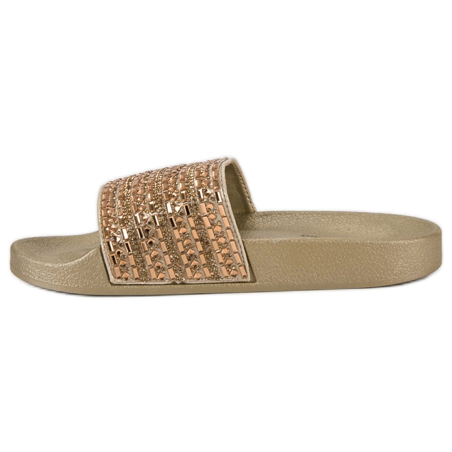 Aus hochwertigem Gummi gefertigt, sind sie leicht und flexibel, wodurch sie sich perfekt an den Fuß anpassen. Die goldene Farbe verleiht ihnen einen phänomenalen Glanz und zusätzliche Strasssteine betonen ihren einzigartigen Charakter und machen sie zu einem definitiven Element jedes Sommer-Stylings.