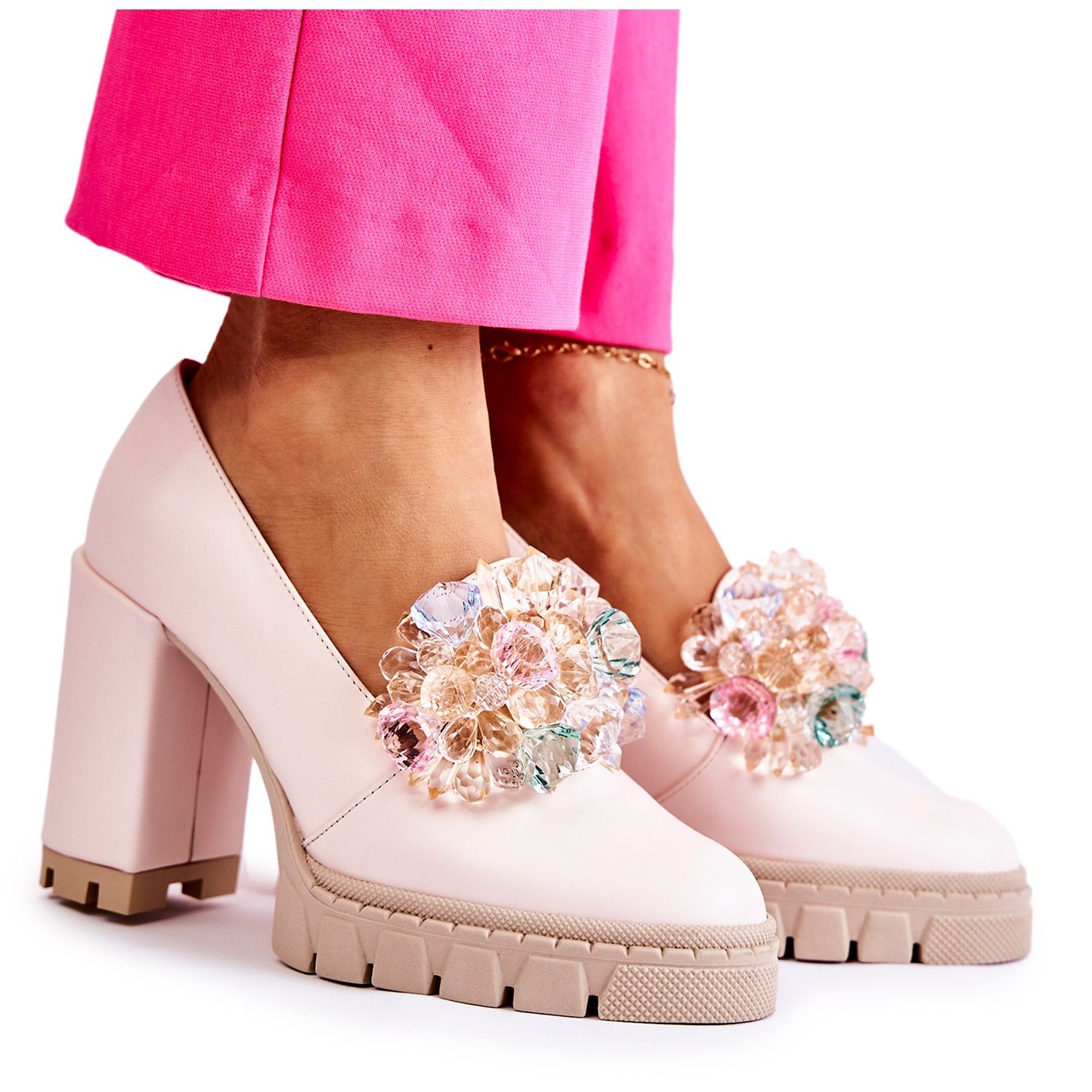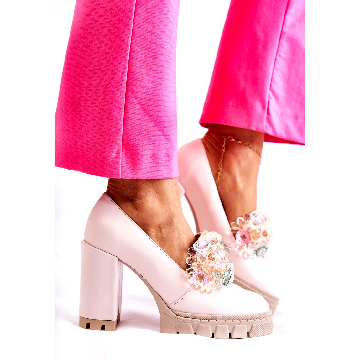 An der Vorderseite der Schuhe befindet sich eine geschmackvolle Dekoration der Nachahmung bunter Kristalle (Strasssteine), die Glanz und Eleganz verleiht. Ein weicher Einsatz aus natürlichen Leder und äußerem Material aus natürlichen Leder garantiert Komfort und Haltbarkeit. Die Pumpen haben eine runde Nasen- und Insertionsinsertion - einfach zu bedienen und universell in Stilisationen.
