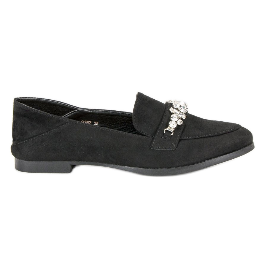 Wir präsentieren elegante schwarze Mokassins der Marke Bestelle, die Komfort und Stil vereinen. Für uns stehen der Komfort Ihrer Füße und die hohe ästhetische Qualität des Schuhwerks im Vordergrund, was sich in diesen einzigartigen Schuhen perfekt widerspiegelt. Schwarze Slip-On-Mokassins, die vorne mit dezenten transparenten Kristallen verziert sind, ziehen mit Sicherheit die Blicke auf sich und sind die perfekte Ergänzung zu vielen verschiedenen Stilen.