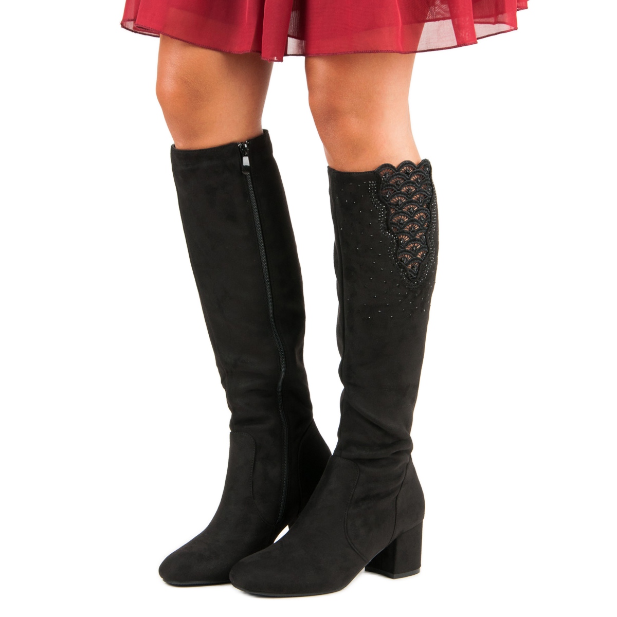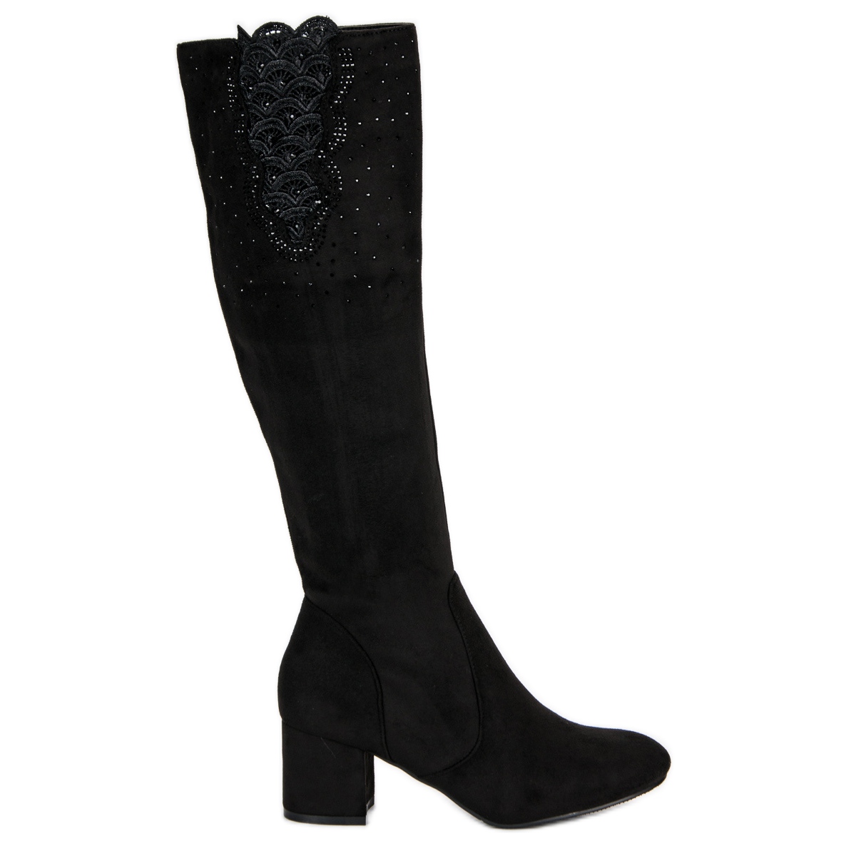 Die schwarzen Stiefel zeichnen sich durch ein wunderschön verziertes Obermaterial aus, das durch eine dezente Spitze an der Oberseite, ergänzt durch zarte Kristalle, die Blicke auf sich zieht. Dieses Detail verleiht ihnen einen einzigartigen Charme und Raffinesse und macht sie zu einer idealen Wahl für besondere Anlässe für Frauen, die Wert auf guten Geschmack und modischen Stil legen.