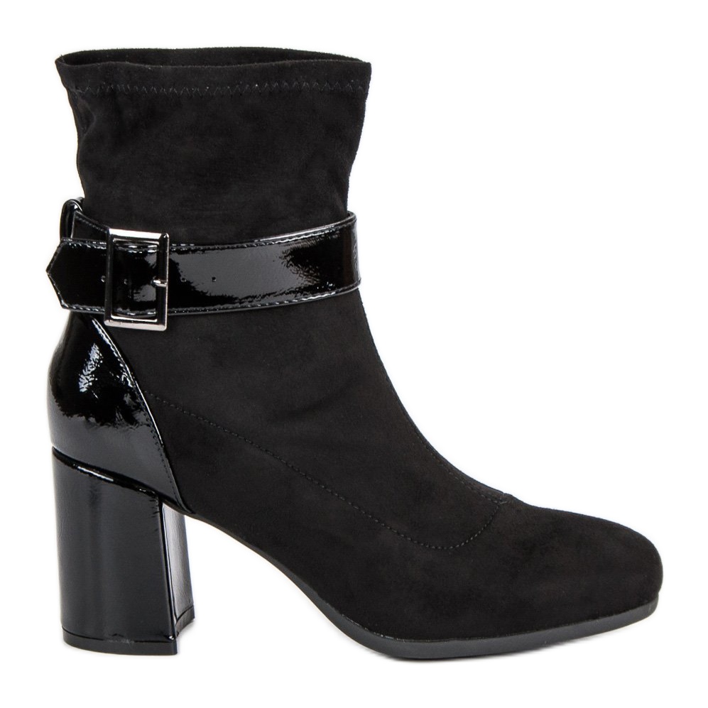 Entdecken Sie Eleganz mit Kylies schwarzen Stiefeletten mit hohen Absätzen. Diese einzigartigen Damenschuhe vereinen klassisches Design mit modernen Akzenten. Diese aus hochwertigem ökologischem Wildleder und ökologischem Lackleder gefertigten Stiefel begeistern nicht nur durch ihr Aussehen, sondern auch durch ihre Haltbarkeit.