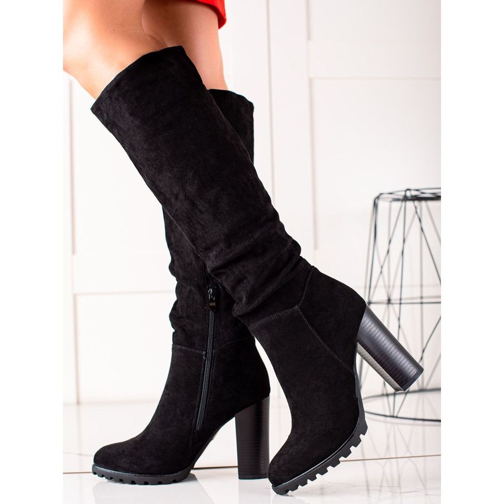 Die Stiefel sind aus hochwertigem Wildlederimitat gefertigt, was ihnen einen eleganten Look verleiht. Die Innenseite der Schuhe ist mit einer Schuhdecke isoliert, was sie perfekt für kalte Tage macht. Die runde Spitze sorgt für Subtilität und der 10 Zentimeter hohe Blockabsatz sorgt für die richtige Höhe und Komfort.