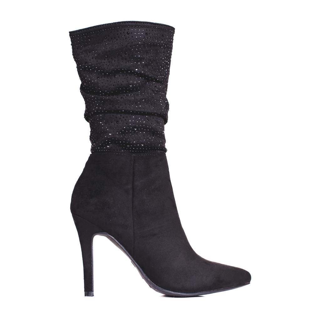 Die Stiefel haben einen hohen Absatz in Form eines 10 cm hohen Stilettos, der für Eleganz sorgt und die Beine optisch verlängert. Eine runde Spitze und ein integrierter Absatz mit Versteifung sorgen dafür, dass die Schuhe gut am Bein anliegen, und zusätzliche Verzierungen in Form von Zirkonen und Strasssteinen verleihen ihnen einen einzigartigen Charakter.