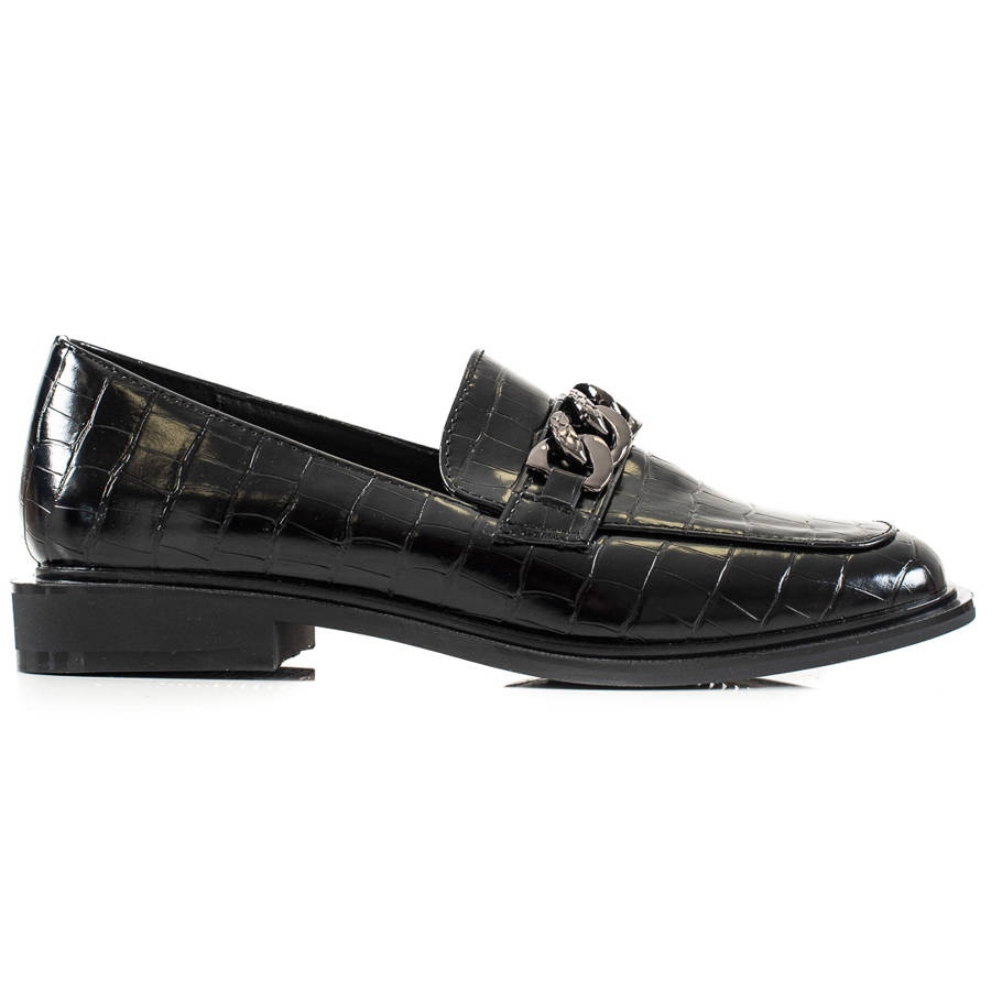 Eine flache, versteifte Ferse und eine Sohle mit Profil aus Kunststoff garantieren Stabilität und Traktion. Ein zusätzlicher Vorteil ist die dekorative Kette und die Strasssteine, die den Schuhen einen einzigartigen Charakter verleihen. Die runde Spitze erhöht den Tragekomfort und die Absatzhöhe von 2,5 cm macht sie perfekt für längere Spaziergänge.