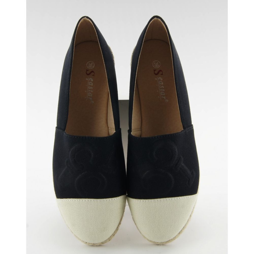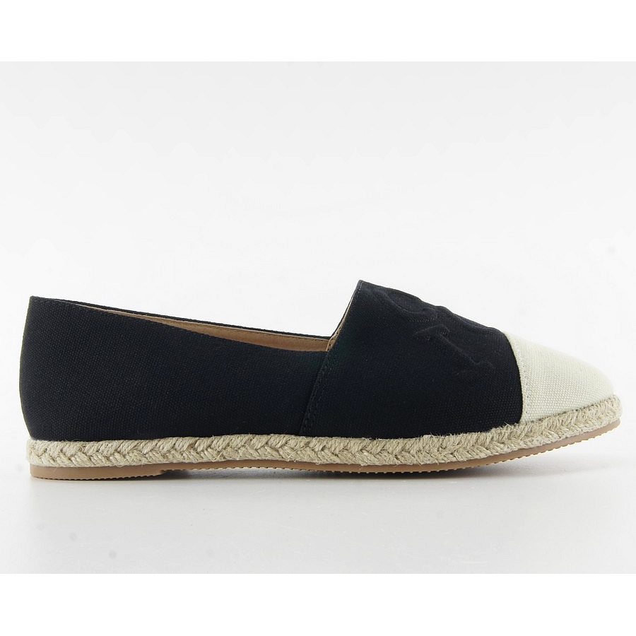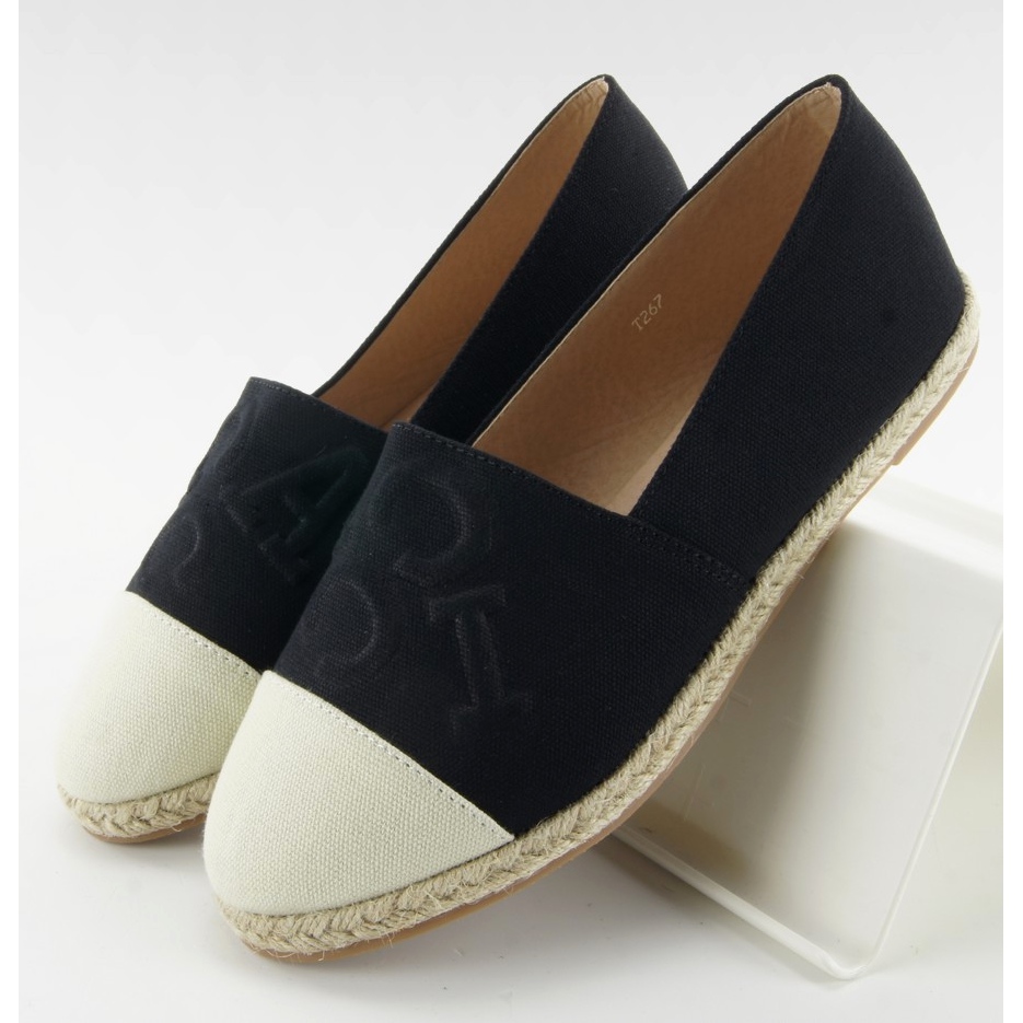 T267 Schwarze Espadrilles – stilvolle, leichte und bequeme Alltagsschuhe. Der klassische Leinenschnitt wird durch eine kontrastierende Schnittspitze und eine Leinenschnur an der Sohle bereichert, was den Schuhen einen natürlichen, sommerlichen Charakter verleiht. Auf der Vorderseite befindet sich eine Prägung in Form von konvexen Buchstaben, die dem Modell Originalität und einen dezenten Premium-Effekt verleiht.