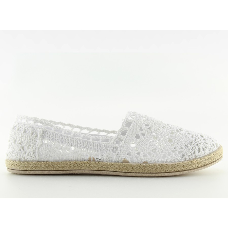 Entdecken Sie die durchbrochenen weißen Spitzen-Espadrilles JX57P, die perfekt zu den Sommertrends passen. Diese eleganten Schuhe im Ballerina-Stil sind sorgfältig aus weißem, weichem Spitzenmaterial gefertigt, was ihnen einen dezenten und mädchenhaften Charakter verleiht.