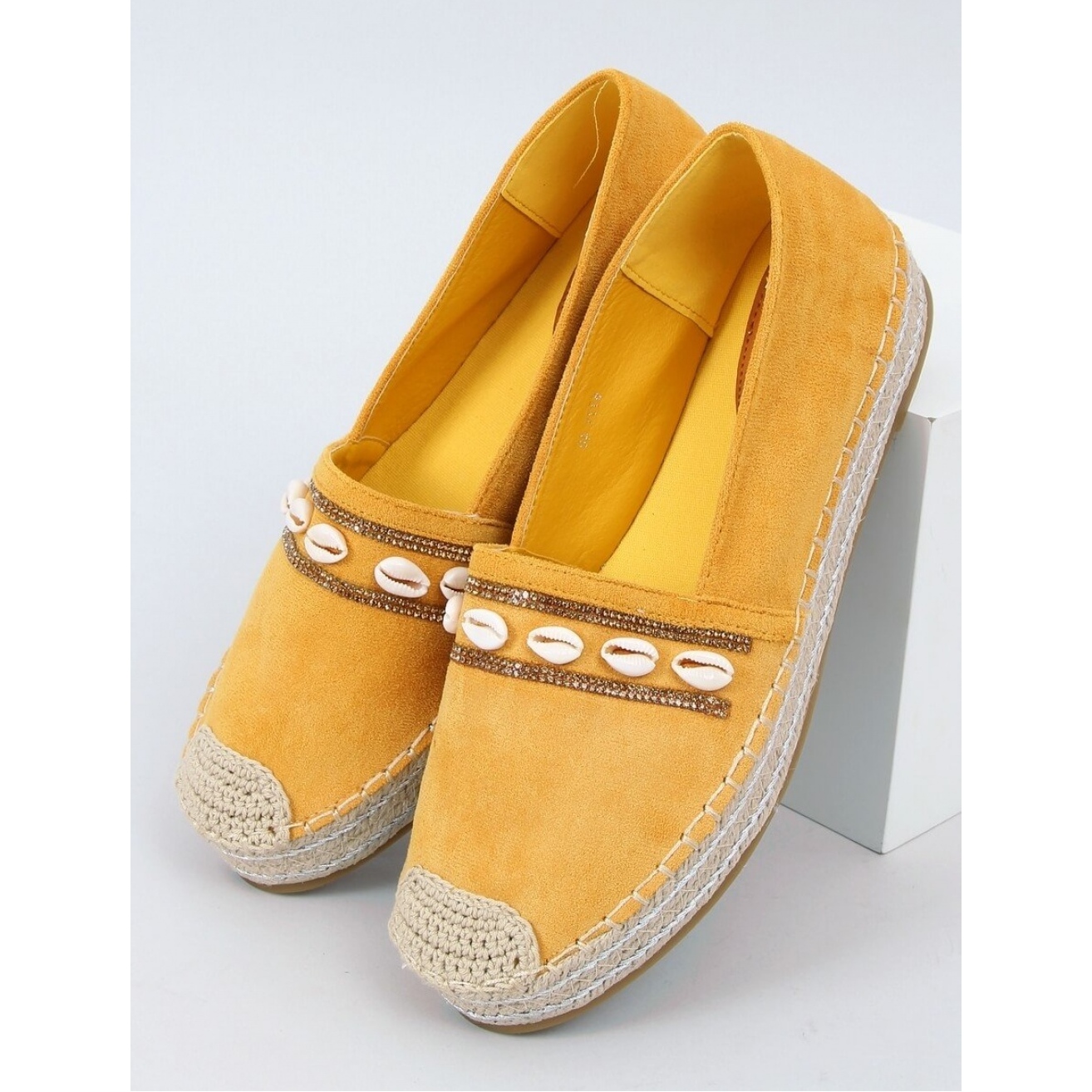 Warten Sie nicht länger! Bereichern Sie Ihre Garderobe mit diesen ungewöhnlichen Espadrilles, die auf dem Bein wunderschön aussehen, und ihre gelbe Farbe wird jeder Sommerschöpfung Energie verleihen. Espadrilles mit Muscheln Honig 6771 Gelb bis Must-Have in dieser Saison!