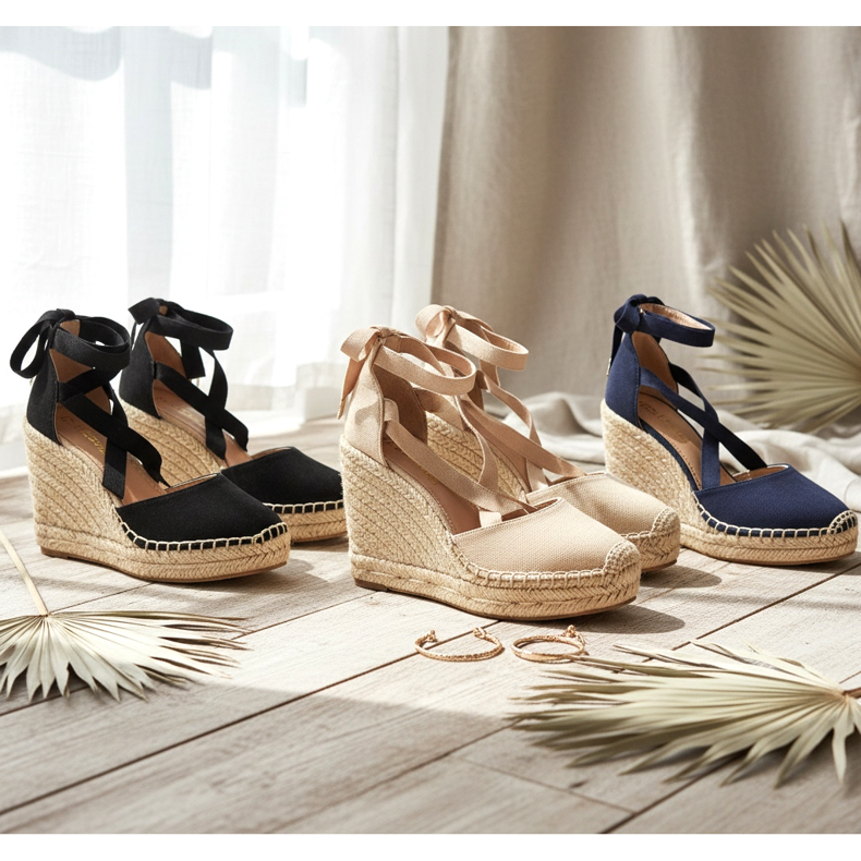 Das Schlüsselelement dieser Schuhe ist eine Sohle aus geflochtener Schnur (Jute) und ein Band um den Knöchel (oft mit einem Band). Der Keil bietet Stabilität und Komfort, die dünnen High Heels fehlen, und erhöht gleichzeitig die Höhe um einige Zentimeter und macht die Wade schlanker. Diese Schuhe eignen sich perfekt für Urlaubsspaziergänge, Dates und Sommerpartys.